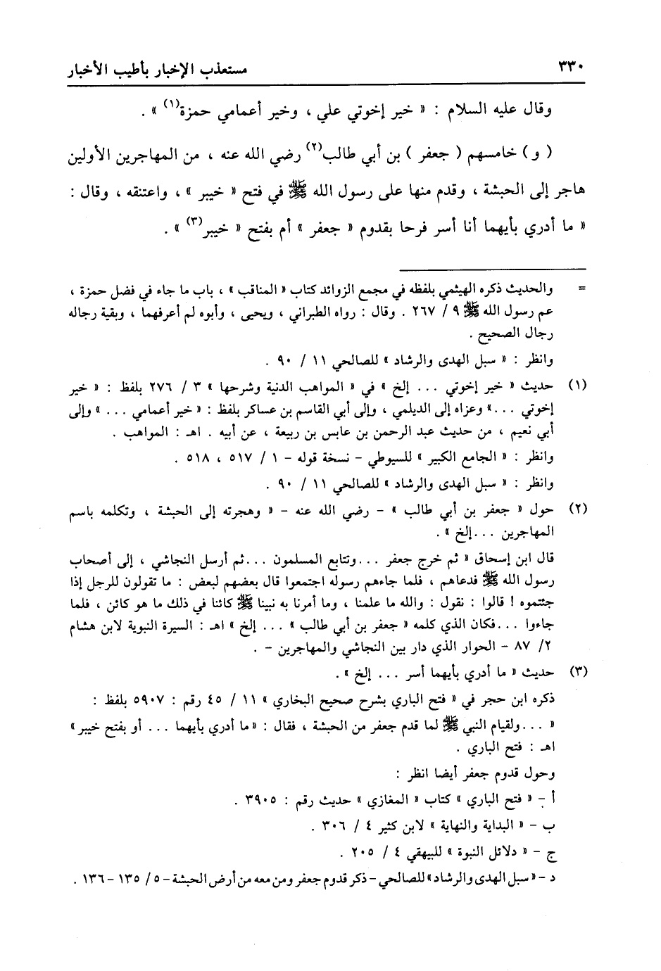 (3) حديث «ما أدري بأيهما أسر ... إلخ» . ذكره ابن حجر في «فتح الباري بشرح صحيح البخاري» 11/ 45 رقم: 5907 بلفظ: « ... ولقيام النبي صلى الله عليه وسلّم لما قدم جعفر من الحبشة، فقال: «ما أدري بأيهما ... أو بفتح خيبر» اه: فتح الباري. وحول قدوم جعفر أيضا انظر: أ- «فتح الباري» كتاب «المغازي» حديث رقم: 3905. ب- «البداية والنهاية» لابن كثير 4/ 306. ج- «دلائل النبوة» للبيهقي 4/ 205. د- «سبل الهدى والرشاد» للصالحي- ذكر قدوم جعفر ومن معه من أرض الحبشة- 5/ 135- 136.