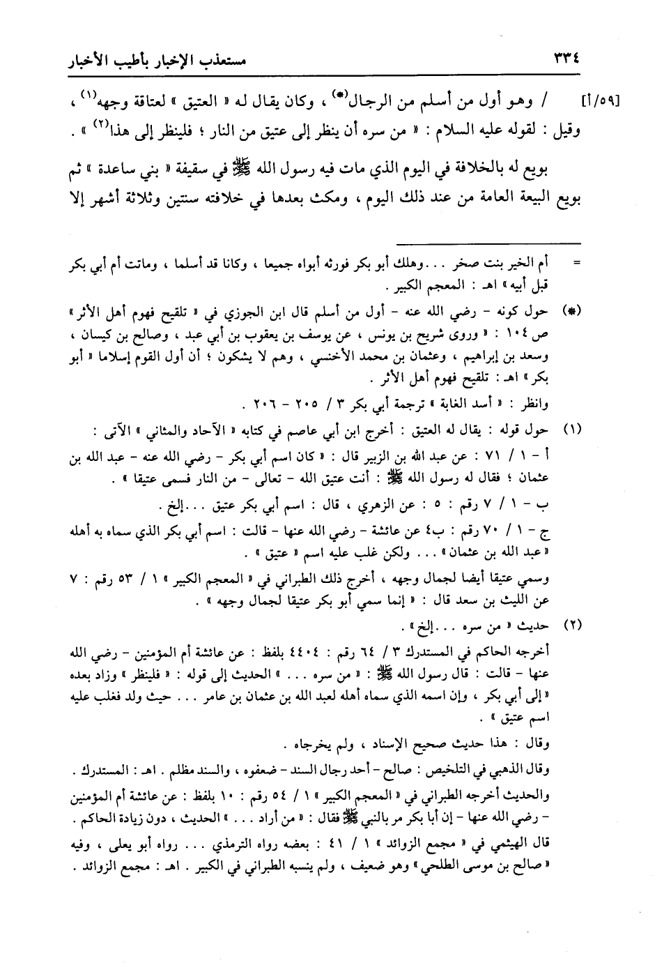 (1) حول قوله: يقال له العتيق: أخرج ابن أبي عاصم في كتابه «الاحاد والمثاني» الاتى: أ- 1/ 71: عن عبد الله بن الزبير قال: «كان اسم أبي بكر- رضي الله عنه- عبد الله بن عثمان؛ فقال له رسول الله صلى الله عليه وسلّم: أنت عتيق الله- تعالى- من النار فسمى عتيقا» . ب- 1/ 7 رقم: 5: عن الزهري، قال: اسم أبي بكر عتيق ... إلخ. ج- 1/ 70 رقم: ب 4 عن عائشة- رضي الله عنها- قالت: اسم أبي بكر الذي سماه به أهله «عبد الله بن عثمان» ... ولكن غلب عليه اسم «عتيق» . وسمي عتيقا أيضا لجمال وجهه، أخرج ذلك الطبراني في «المعجم الكبير» 1/ 53 رقم: 7 عن الليث بن سعد قال: «إنما سمي أبو بكر عتيقا لجمال وجهه» .