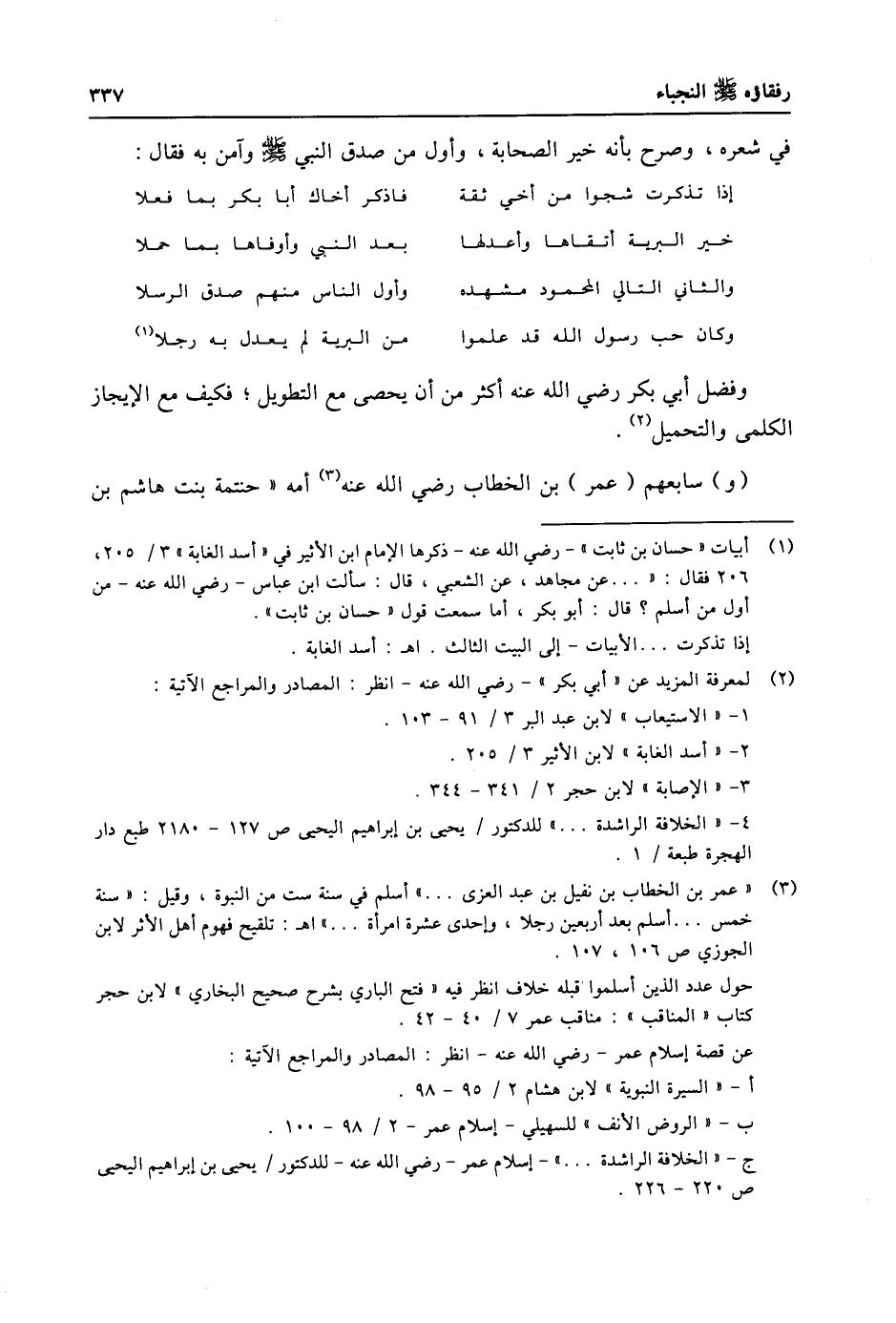 (3) «عمر بن الخطاب بن نفيل بن عبد العزى ... » أسلم في سنة ست من النبوة، وقيل: «سنة خمس ... أسلم بعد أربعين رجلا، وإحدى عشرة امرأة ... » اه: تلقيح فهوم أهل الأثر لابن الجوزي ص 106، 107. حول عدد الذين أسلموا قبله خلاف انظر فيه «فتح الباري بشرح صحيح البخاري» لابن حجر كتاب «المناقب» : مناقب عمر 7/ 40- 42. عن قصة إسلام عمر- رضي الله عنه- انظر: المصادر والمراجع الاتية: أ- «السيرة النبوية» لابن هشام 2/ 95- 98. ب- «الروض الأنف» للسهيلي- إسلام عمر- 2/ 98- 100. ج- «الخلافة الراشدة ... » - إسلام عمر- رضي الله عنه- للدكتور/ يحيى بن إبراهيم اليحيى ص 220- 226.