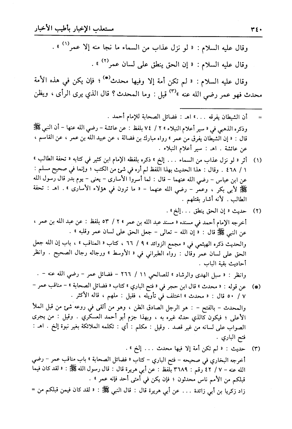 (*) عن قوله: «محدث» قال ابن حجر في «فتح الباري» كتاب «فضائل الصحابة» - مناقب عمر- 7/ 50 قال: «محدث» اختلف في تأويله، فقيل: ملهم، قاله الأكثر. والمحدث- بالفتح-: هو الرجل الصادق الظن، وهو من ألقى في روعه شئ من قبل الملأ الأعلى؛ فيكون كالذي حدثه غيره به، وبهذا جزم أبو أحمد العسكري. وقيل: من يجرى الصواب على لسانه من غير قصد. وقيل: مكلم: أي: تكلمه الملائكة بغير نبوة إلخ. اه: فتح الباري.