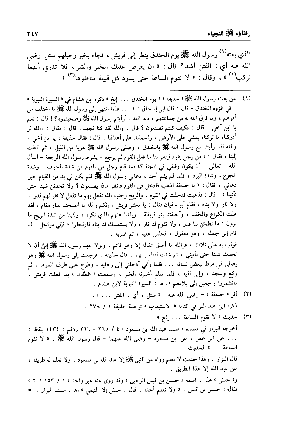 (2) أثر «حذيفة» - رضي الله عنه- «سئل، أي: الفتن ... » . ذكره ابن عبد البر في كتابه «الاستيعاب» ترجمة حذيفة 1/ 278.