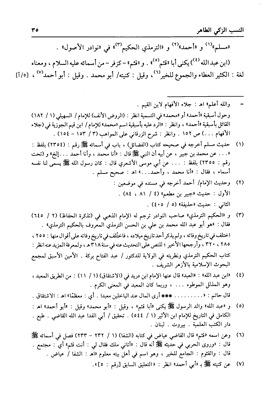 (6) وعن اسمه «قثم» قال القاضي عياض في كتابه (الشفا) (1/ 232- 233) فصل في أسمائه صلى الله عليه وسلّم قال: «وروى الحربي في حديثه صلى الله عليه وسلّم أنه قال: «أتاني ملك فقال لي: أنت قثم» أي: مجتمع. قال: والقثوم: الجامع للخير، وهو اسم في أهل بيته معلوم «اه: الشفا/ عياض.