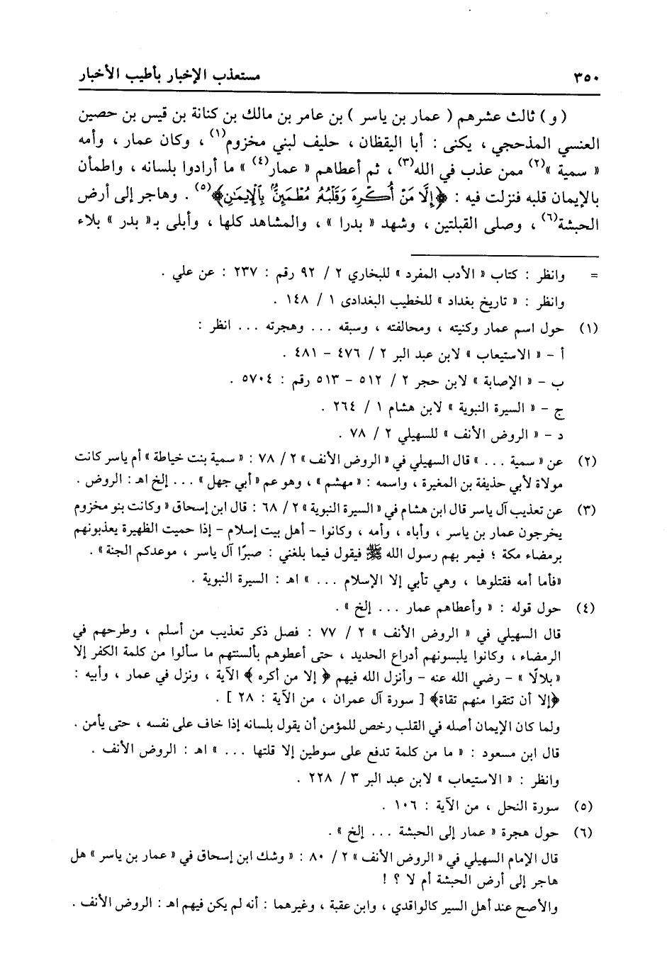 (6) حول هجرة «عمار إلى الحبشة ... إلخ» . قال الإمام السهيلي في «الروض الأنف» 2/ 80: «وشك ابن إسحاق في «عمار بن ياسر» هل هاجر إلى أرض الحبشة أم لا؟! والأصح عند أهل السير كالواقدي، وابن عقبة، وغيرهما: أنه لم يكن فيهم اه: الروض الأنف.