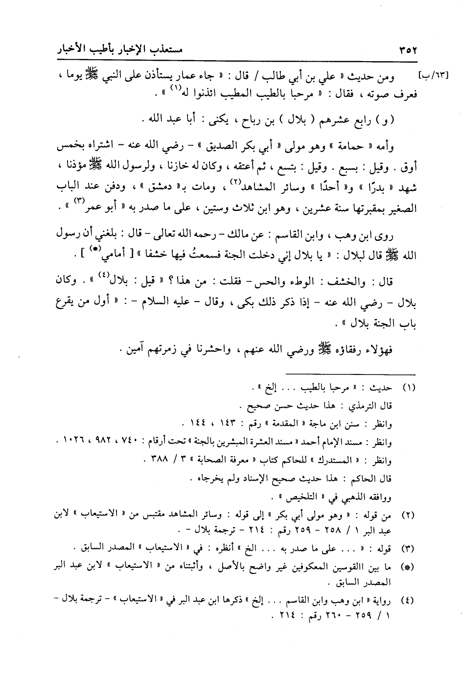 (2) من قوله: «وهو مولى أبي بكر» إلى قوله: وسائر المشاهد مقتبس من «الاستيعاب» لابن عبد البر 1/ 258- 259 رقم: 214- ترجمة بلال-.