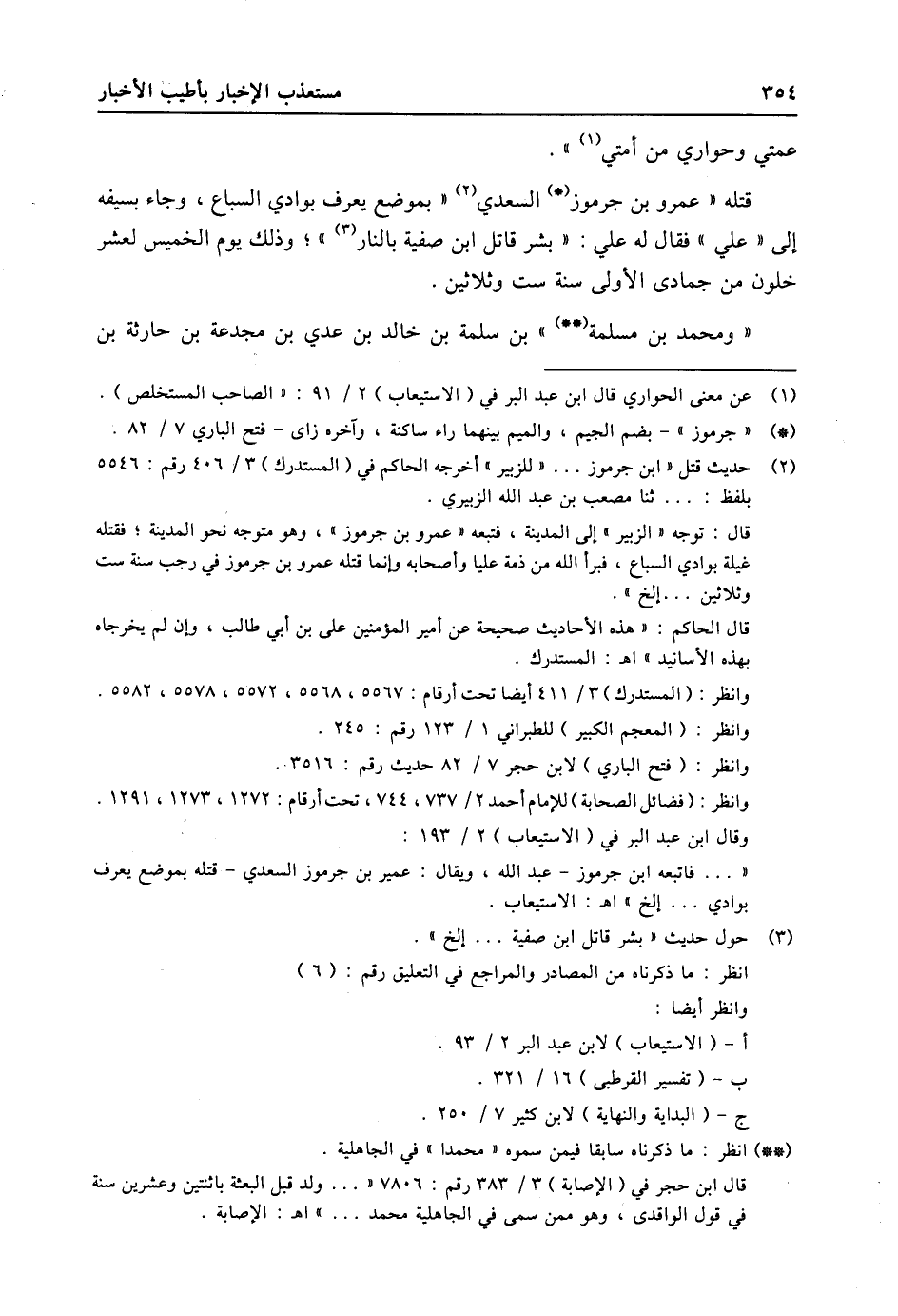 (2) حديث قتل «ابن جرموز ... «للزبير» أخرجه الحاكم في (المستدرك) 3/ 406 رقم: 5546 بلفظ: ... ثنا مصعب بن عبد الله الزبيري. قال: توجه «الزبير» إلى المدينة، فتبعه «عمرو بن جرموز» ، وهو متوجه نحو المدينة؛ فقتله غيلة بوادي السباع، فبرأ الله من ذمة عليا وأصحابه وإنما قتله عمرو بن جرموز في رجب سنة ست وثلاثين ... إلخ» . قال الحاكم: «هذه الأحاديث صحيحة عن أمير المؤمنين على بن أبي طالب، وإن لم يخرجاه بهذه الأسانيد» اه: المستدرك. وانظر: (المستدرك) 3/ 411 أيضا تحت أرقام: 5567، 5568، 5572، 5578، 5582. وانظر: (المعجم الكبير) للطبراني 1/ 123 رقم: 245. وانظر: (فتح الباري) لابن حجر 7/ 82 حديث رقم: 3516. وانظر: (فضائل الصحابة) للإمام أحمد 2/ 737، 744، تحت أرقام: 1272، 1273، 1291. وقال ابن عبد البر في (الاستيعاب) 2/ 193: « ... فاتبعه ابن جرموز- عبد الله، ويقال: عمير بن جرموز السعدي- قتله بموضع يعرف بوادي ... إلخ» اه: الاستيعاب.