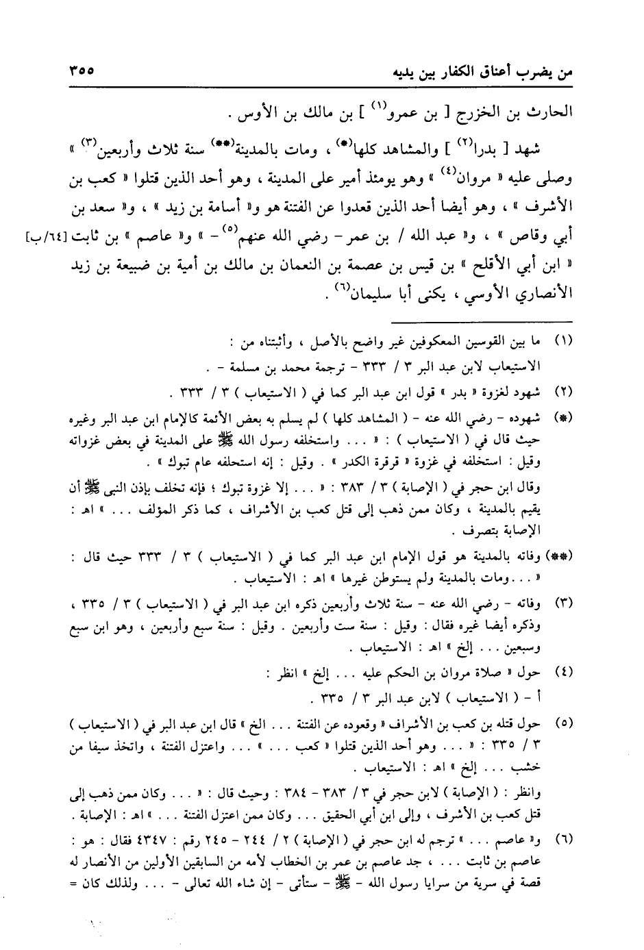 (*) شهوده- رضي الله عنه- (المشاهد كلها) لم يسلم به بعض الأئمة كالإمام ابن عبد البر وغيره حيث قال في (الاستيعاب) : « ... واستخلفه رسول الله صلى الله عليه وسلّم على المدينة في بعض غزواته وقيل: استخلفه في غزوة «قرقرة الكدر» . وقيل: إنه استحلفه عام تبوك» . وقال ابن حجر في (الإصابة) 3/ 383: « ... إلا غزوة تبوك؛ فإنه تخلف بإذن النبي صلى الله عليه وسلّم أن يقيم بالمدينة، وكان ممن ذهب إلى قتل كعب بن الأشراف، كما ذكر المؤلف ... » اه: الإصابة بتصرف.