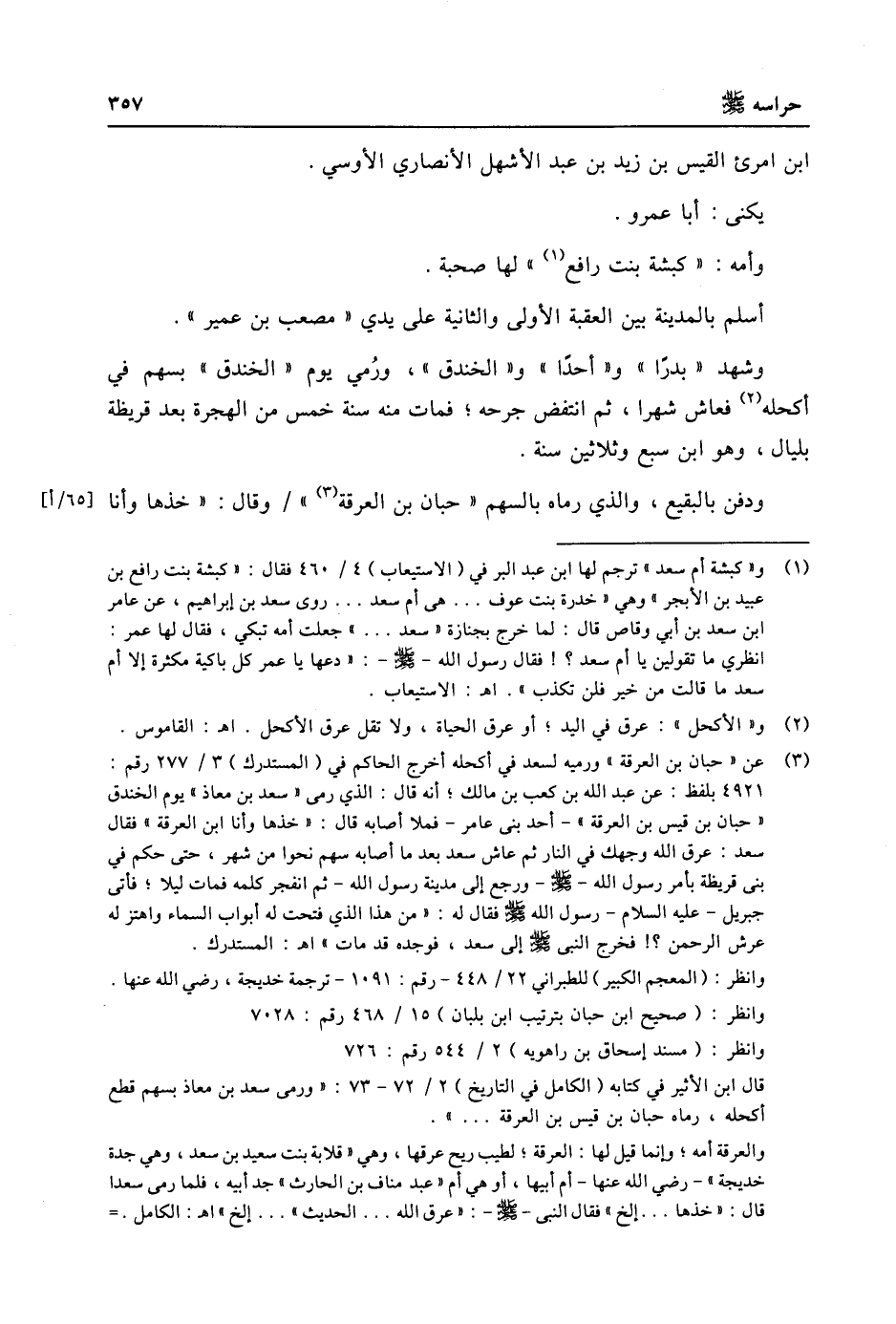 (3) عن «حبان بن العرقة» ورميه لسعد في أكحله أخرج الحاكم في (المستدرك) 3/ 277 رقم: 4921 بلفظ: عن عبد الله بن كعب بن مالك؛ أنه قال: الذي رمى «سعد بن معاذ» يوم الخندق «حبان بن قيس بن العرقة» - أحد بنى عامر- فملا أصابه قال: «خذها وأنا ابن العرقة» فقال سعد: عرق الله وجهك في النار ثم عاش سعد بعد ما أصابه سهم نحوا من شهر، حتى حكم في بنى قريظة بأمر رسول الله- صلى الله عليه وسلّم- ورجع إلى مدينة رسول الله- ثم انفجر كلمه فمات ليلا؛ فأتى جبريل- عليه السلام- رسول الله صلى الله عليه وسلّم فقال له: «من هذا الذي فتحت له أبواب السماء واهتز له عرش الرحمن؟! فخرج النبي صلى الله عليه وسلّم إلى سعد، فوجده قد مات» اه: المستدرك. وانظر: (المعجم الكبير) للطبراني 22/ 448- رقم: 1091- ترجمة خديجة، رضي الله عنها. وانظر: (صحيح ابن حبان بترتيب ابن بلبان) 15/ 468 رقم: 7028. وانظر: (مسند إسحاق بن راهويه) 2/ 544 رقم: 726. قال ابن الأثير في كتابه (الكامل في التاريخ) 2/ 72- 73: «ورمى سعد بن معاذ بسهم قطع أكحله، رماه حبان بن قيس بن العرقة ... » . والعرقة أمه؛ وإنما قيل لها: العرقة؛ لطيب ريح عرقها، وهي «قلابة بنت سعيد بن سعد، وهي جدة خديجة» - رضي الله عنها- أم أبيها، أو هي أم «عبد مناف بن الحارث» جد أبيه، فلما رمى سعدا قال: «خذها ... إلخ» فقال النبي- صلى الله عليه وسلّم-: «عرق الله ... الحديث» ... إلخ» اه: الكامل. -