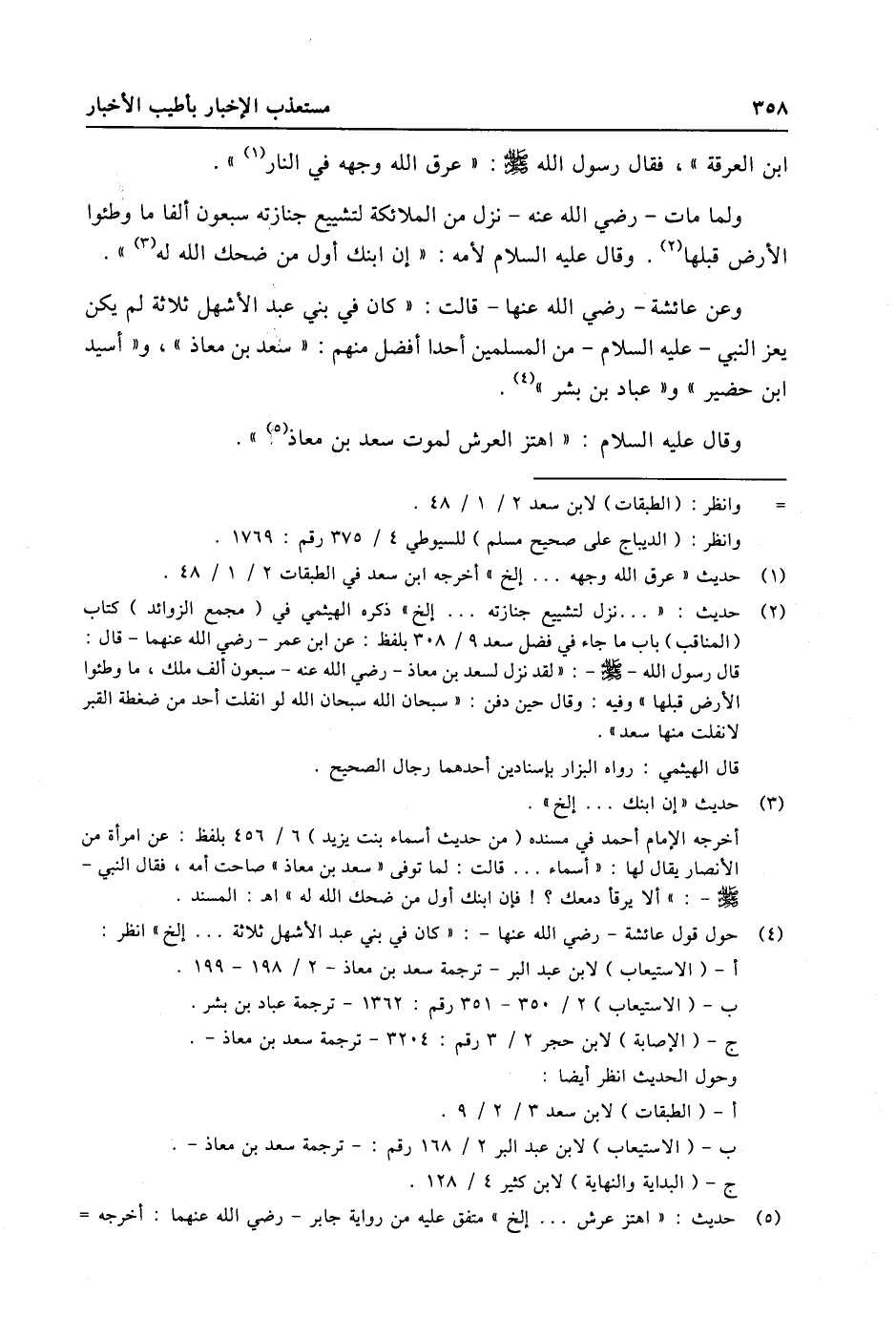 (4) حول قول عائشة- رضي الله عنها-: «كان في بني عبد الأشهل ثلاثة ... إلخ» انظر: أ- (الاستيعاب) لابن عبد البر- ترجمة سعد بن معاذ- 2/ 198- 199. ب- (الاستيعاب) 2/ 350- 351 رقم: 1362- ترجمة عباد بن بشر. ج- (الإصابة) لابن حجر 2/ 3 رقم: 3204- ترجمة سعد بن معاذ-. وحول الحديث انظر أيضا: أ- (الطبقات) لابن سعد 3/ 2/ 9. ب- (الاستيعاب) لابن عبد البر 2/ 168 رقم: - ترجمة سعد بن معاذ-. ج- (البداية والنهاية) لابن كثير 4/ 128.