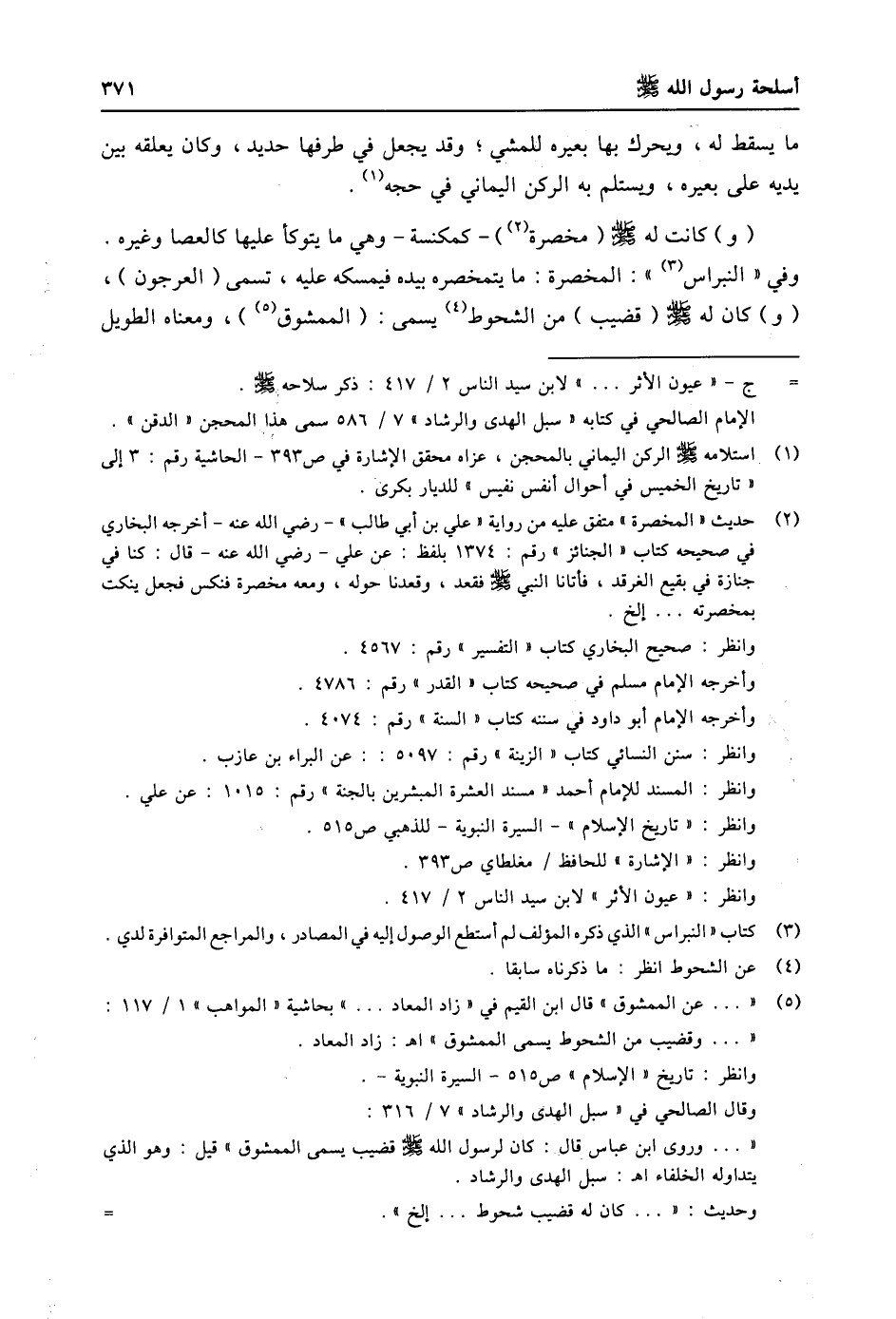 - ج- «عيون الأثر ... » لابن سيد الناس 2/ 417: ذكر سلاحه صلى الله عليه وسلّم. الإمام الصالحي في كتابه «سبل الهدى والرشاد» 7/ 586 سمى هذا المحجن «الدقن» .