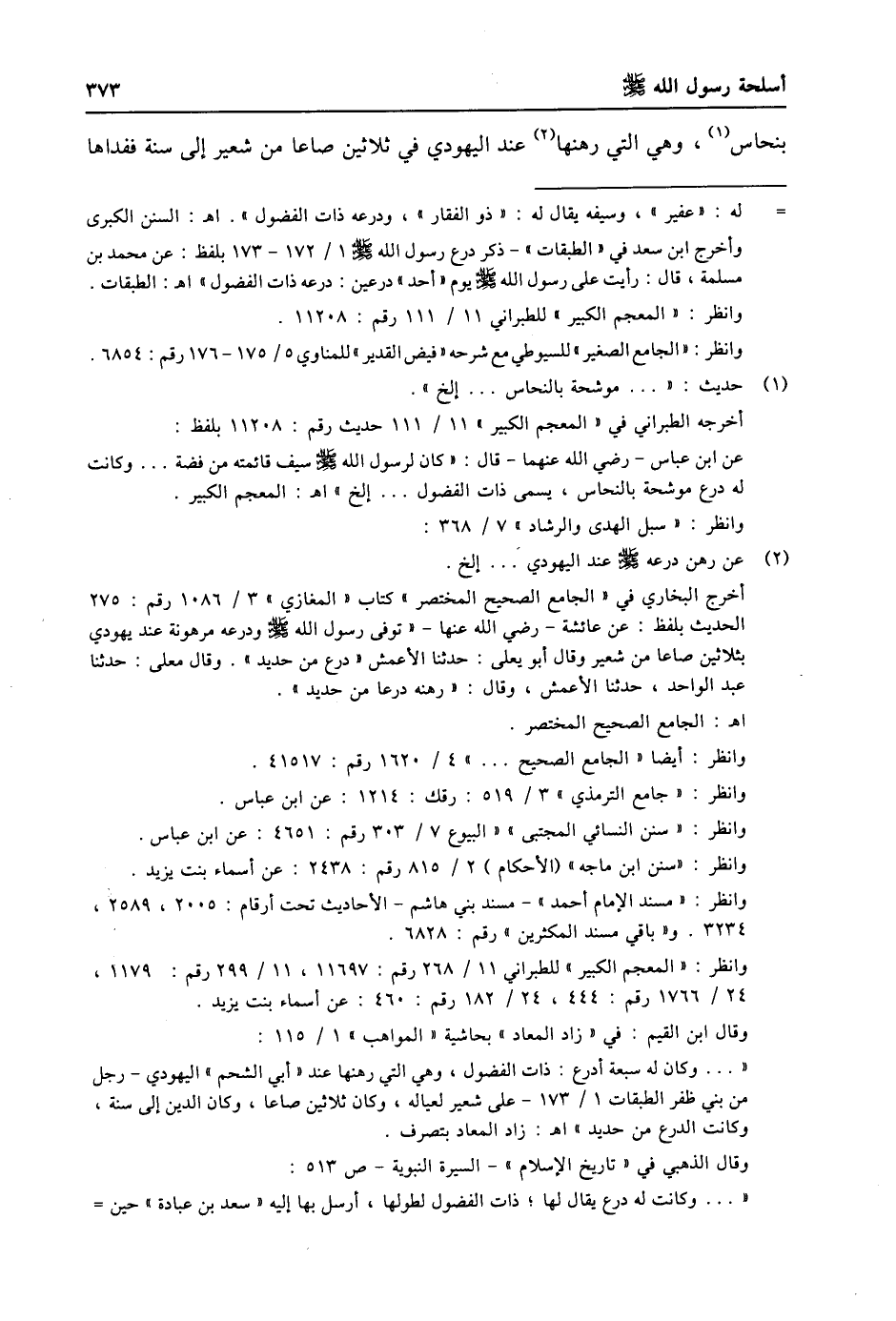 (2) عن رهن درعه صلى الله عليه وسلّم عند اليهودي ... إلخ. أخرج البخاري في «الجامع الصحيح المختصر» كتاب «المغازي» 3/ 1086 رقم: 275 الحديث بلفظ: عن عائشة- رضي الله عنها- «توفي رسول الله صلى الله عليه وسلّم ودرعه مرهونة عند يهودي بثلاثين صاعا من شعير وقال أبو يعلى: حدثنا الأعمش «درع من حديد» . وقال معلى: حدثنا عبد الواحد، حدثنا الأعمش، وقال: «رهنه درعا من حديد» . اه: الجامع الصحيح المختصر. وانظر: أيضا «الجامع الصحيح ... » 4/ 1620 رقم: 41517. وانظر: «جامع الترمذي» 3/ 519: رقك: 1214: عن ابن عباس. وانظر: «سنن النسائي المجتبى» «البيوع 7/ 303 رقم: 4651: عن ابن عباس. وانظر: «سنن ابن ماجه» (الأحكام) 2/ 815 رقم: 2438: عن أسماء بنت يزيد. وانظر: «مسند الإمام أحمد» - مسند بني هاشم- الأحاديث تحت أرقام: 2005، 2589، 3234. و «باقي مسند المكثرين» رقم: 6828. وانظر: «المعجم الكبير» للطبراني 11/ 268 رقم: 11697، 11/ 299 رقم: 1179، 24/ 1766 رقم: 444، 24/ 182 رقم: 460: عن أسماء بنت يزيد. وقال ابن القيم: في «زاد المعاد» بحاشية «المواهب» 1/ 115: « ... وكان له سبعة أدرع: ذات الفضول، وهي التي رهنها عند «أبي الشحم» اليهودي- رجل من بني ظفر الطبقات 1/ 173- على شعير لعياله، وكان ثلاثين صاعا، وكان الدين إلى سنة، وكانت الدرع من حديد» اه: زاد المعاد بتصرف. وقال الذهبي في «تاريخ الإسلام» - السيرة النبوية- ص 513: « ... وكانت له درع يقال لها؛ ذات الفضول لطولها، أرسل بها إليه «سعد بن عبادة» حين-