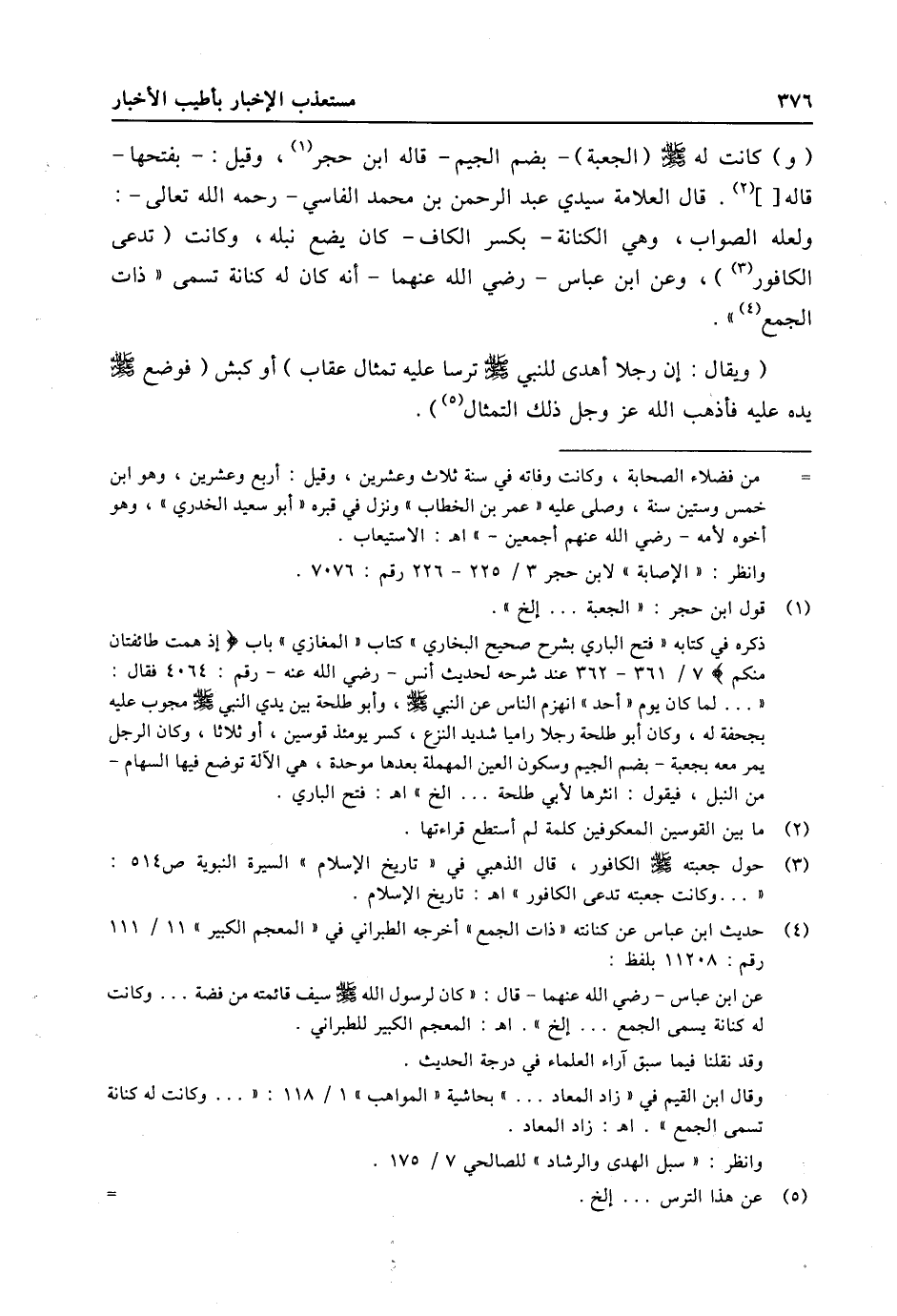 (4) حديث ابن عباس عن كنانته «ذات الجمع» أخرجه الطبراني في «المعجم الكبير» 11/ 111 رقم: 11208 بلفظ: عن ابن عباس- رضي الله عنهما- قال: «كان لرسول الله صلى الله عليه وسلّم سيف قائمته من فضة ... وكانت له كنانة يسمى الجمع ... إلخ» . اه: المعجم الكبير للطبراني. وقد نقلنا فيما سبق آراء العلماء في درجة الحديث. وقال ابن القيم في «زاد المعاد ... » بحاشية «المواهب» 1/ 118: « ... وكانت له كنانة تسمى الجمع» . اه: زاد المعاد. وانظر: «سبل الهدى والرشاد» للصالحي 7/ 175.