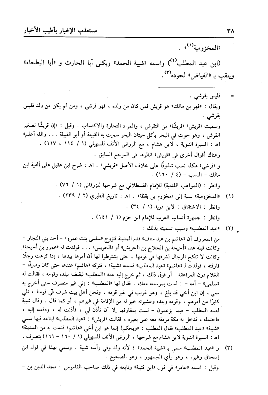 (2) «عبد المطلب» وسبب تسميته بذلك: من المعروف أن «هاشم بن عبد مناف» قدم المدينة فتزوج «سلمى بنت عمرو» - أحد بني النجار- وكانت قبله عند «أحيحة بن الحلاج بن الحريش» أو «الحريس» ... فولدت له «عمرو بن أحيحة» وكانت لا تنكح الرجال لشرفها في قومها، حتى يشترطوا لها أن أمرها بيدها، إذا كرهت رجلا فارقته، فولدت ل «هاشم» «عبد المطلب» فسمته «شيبة» ، فتركه «هاشم» عندها حتى كان وصيفا- الغلام دون المراهقة- أو فوق ذلك، ثم خرج إليه عمه «المطلب» ليقبضه ببلده وقومه، فقالت له «سلمى» - أمه-: لست بمرسلته معك. فقال لها «المطلب» : إني غير منصرف حتى أخرج به معي، إن ابن أخي قد بلغ، وهو غريب في غير قومه، ونحن أهل بيت شرف في قومنا، نلي كثيرا من أمرهم، وقومه وبلده وعشيرته خير له من الإقامة في غيرهم، أو كما قال. وقال شيبة لعمه المطلب- فيما يزعمون- لست بمفارقها إلا أن تأذن لي، فأذنت له، ودفعته إليه، فاحتمله، فدخل به مكة مردفه معه على بعيره، فقالت «قريش» : «عبد المطلب» ابتاعه فبها سمي «شيبة» «عبد المطلب» فقال المطلب: «ويحكم! إنما هو ابن أخي «هاشم» قدمت به من المدينة» اه: السيرة النبوية لابن هشام مع شرحها، الروض الأنف للسهيلي (1/ 160- 161) بتصرف.