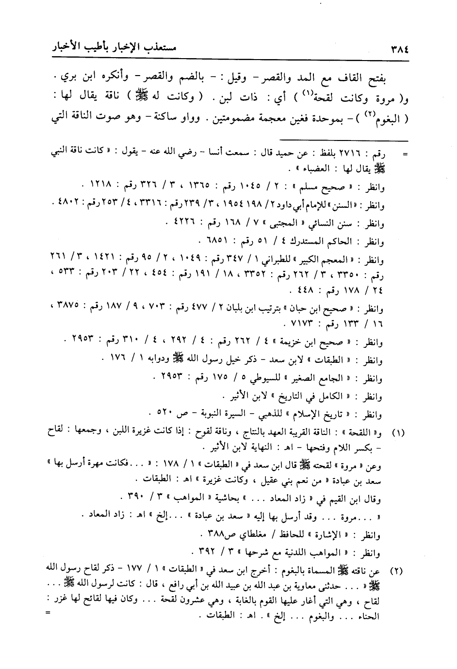 - رقم: 2716 بلفظ: عن حميد قال: سمعت أنسا- رضي الله عنه- يقول: «كانت ناقة النبي صلى الله عليه وسلّم يقال لها: العضباء» . وانظر: «صحيح مسلم» : 2/ 1045 رقم: 1365، 3/ 326 رقم: 1218. وانظر: «السنن» للإمام أبي داود 2/ 1954198، 3/ 239 رقم: 3316، 4/ 253 رقم: 4802. وانظر: سنن النسائي «المجتبى» 7/ 168 رقم: 4226. وانظر: الحاكم المستدرك 4/ 51 رقم: 6851. وانظر: «المعجم الكبير» للطبراني 1/ 347 رقم: 1049، 2/ 95 رقم: 1421، 3/ 261 رقم: 3350، 3/ 262 رقم: 3352، 18/ 191 رقم: 454، 22/ 203 رقم: 533، 24/ 178 رقم: 448. وانظر: «صحيح ابن حبان» بترتيب ابن بلبان 2/ 477 رقم: 703، 9/ 187 رقم: 3875، 16/ 133 رقم: 7173. وانظر: «صحيح ابن خزيمة» 4/ 262 رقم: 4/ 292، 4/ 310 رقم: 2953. وانظر: «الطبقات» لابن سعد- ذكر خيل رسول الله صلى الله عليه وسلّم ودوابه 1/ 176. وانظر: «الجامع الصغير» للسيوطي 5/ 175 رقم: 2953. وانظر: «الكامل في التاريخ» لابن الأثير. وانظر: «تاريخ الإسلام» للذهبي- السيرة النبوية- ص 520.