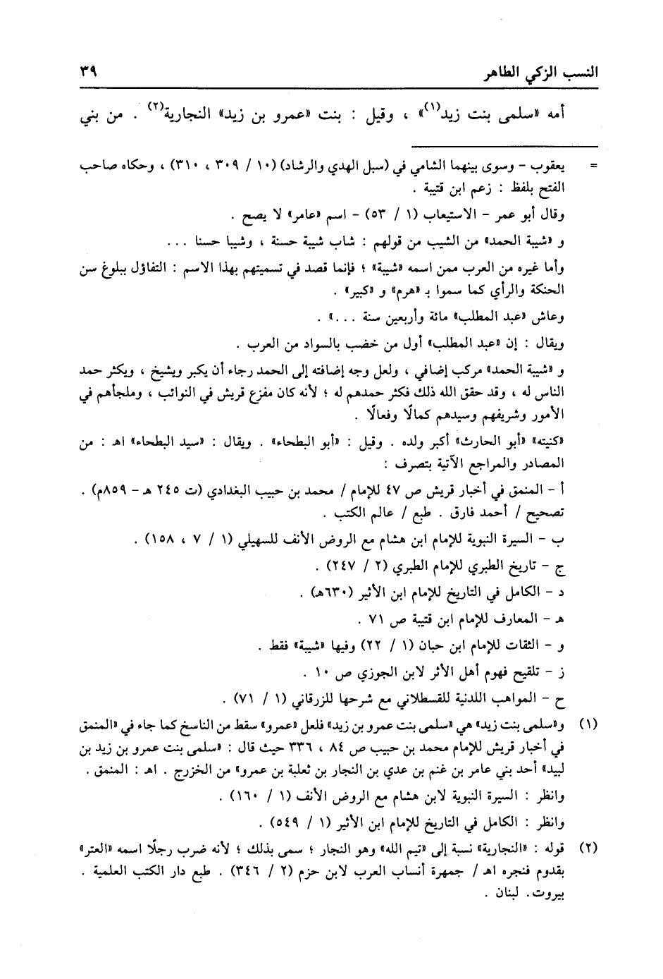 (1) و «سلمى بنت زيد» هي «سلمى بنت عمرو بن زيد» فلعل «عمرو» سقط من الناسخ كما جاء في «المنمق في أخبار قريش للإمام محمد بن حبيب ص 84، 336 حيث قال: «سلمى بنت عمرو بن زيد بن لبيد» أحد بني عامر بن غنم بن عدي بن النجار بن ثعلبة بن عمرو» من الخزرج. اه: المنمق. وانظر: السيرة النبوية لابن هشام مع الروض الأنف (1/ 160) . وانظر: الكامل في التاريخ للإمام ابن الأثير (1/ 549) .