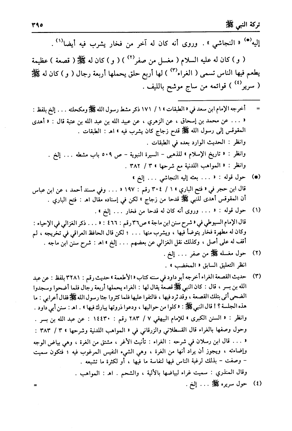 (*) حول قوله: « ... بعثه إليه النجاشي ... إلخ» قال ابن حجر في «فتح الباري» 1/ 304 رقم: 197 « ... وفي مسند أحمد، عن ابن عباس أن المقوقس أهدى للنبي صلى الله عليه وسلّم قدحا من زجاج» لكن في إسناده مقال اه: فتح الباري.