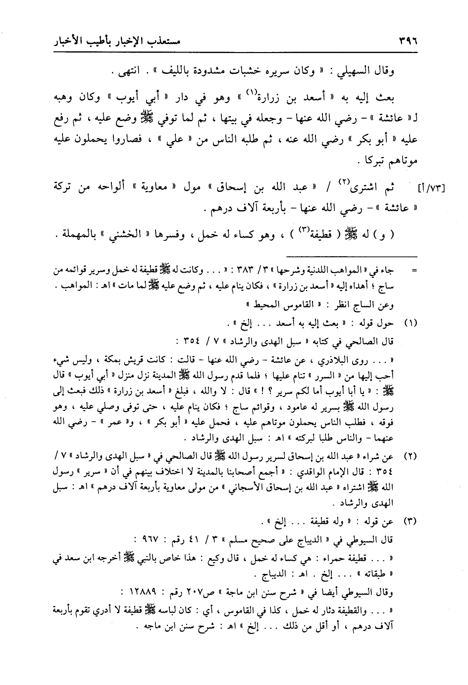 (1) حول قوله: «بعث إليه به أسعد ... إلخ» . قال الصالحي في كتابه «سبل الهدى والرشاد» 7/ 354: « ... روى البلاذري، عن عائشة- رضي الله عنها- قالت: كانت قريش بمكة، وليس شيء أحب إليها من «السرر» تنام عليها؛ فلما قدم رسول الله صلى الله عليه وسلّم المدينة نزل منزل «أبي أيوب» قال صلى الله عليه وسلّم: «يا أبا أيوب أما لكم سرير؟!» قال: لا والله، فبلغ «أسعد بن زرارة» ذلك فبعث إلى رسول الله صلى الله عليه وسلّم بسرير له عامود، وقوائم ساج؛ فكان ينام عليه، حتى توفى وصلي عليه، وهو فوقه، فطلب الناس يحملون موتاهم عليه، فحمل عليه «أبو بكر» ، و «عمر» - رضي الله عنهما- والناس طلبا لبركته» اه: سبل الهدى والرشاد.