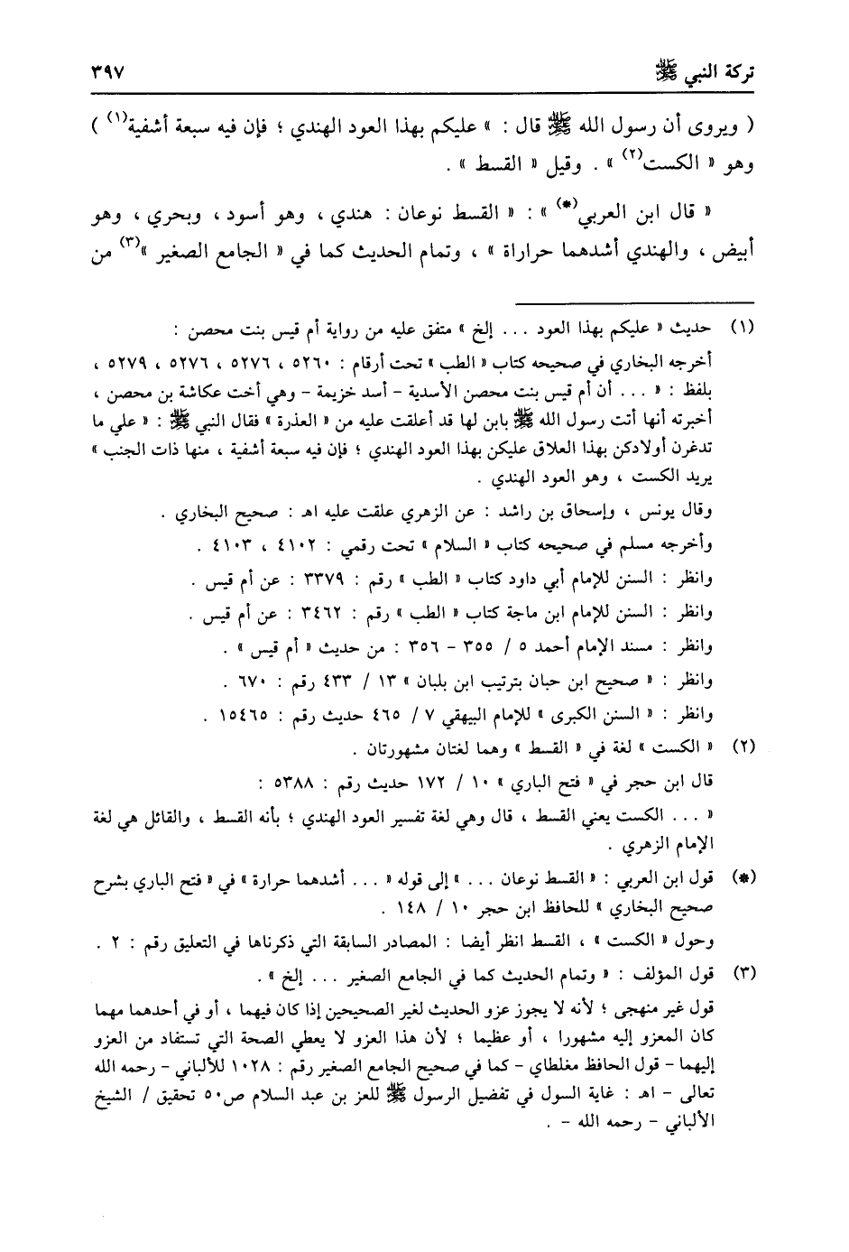 (*) قول ابن العربي: «القسط نوعان ... » إلى قوله « ... أشدهما حرارة» في «فتح الباري بشرح صحيح البخاري» للحافظ ابن حجر 10/ 148. وحول «الكست» ، القسط انظر أيضا: المصادر السابقة التي ذكرناها في التعليق رقم: 2.