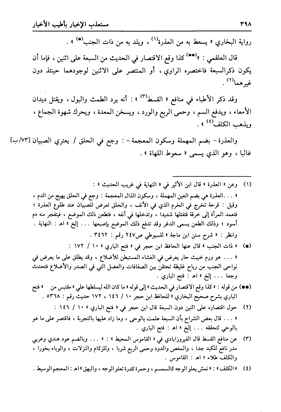 (1) وعن «العذرة» قال ابن الأثير في «النهاية في غريب الحديث» : « ... العذرة هي بضم العين المهملة، وسكون الذال المعجمة: وجع في الحلق يهيج من الدم، وقيل: قرحة تخرج في الخرم الذي في الأنف، والحلق تعرض للصبيان عند طلوع العذرة؛ فتعمد المرأة إلى خرقة فتفتلها شديدا، وتدخلها في أنفه، فتطعن ذلك الموضع، فيتفجر منه دم أسود؛ وذلك الطعن يسمى الدغر وقد تدفع ذلك الموضع بإصبعها ... إلخ» اه: النهاية. وانظر: «شرح سنن ابن ماجة» للسيوطي ص 247 رقم: 3462.