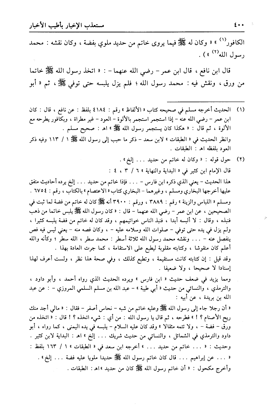 (2) حول قوله: «وكان له خاتم من حديد ... إلخ» . قال الإمام ابن كثير في «البداية والنهاية» 6/ 3، 4: هذا الحديث- يعني الذي ذكره ابن فارس- ... فإذا خاتم من حديد ... إلخ يرده أحاديث متفق عليها أخرجها البخاري ومسلم، وغيرهما- البخاري كتاب «الاعتصام» بالكتاب، رقم: 6754. ومسلم «اللباس والزينة» رقم: 3889، ورقم: 3900 أنه صلى الله عليه وسلّم كان له خاتم من فضة لما ثبت في الصحيحين، عن ابن عمر- رضي الله عنهما- قال: «كان رسول الله صلى الله عليه وسلّم يلبس خاتما من ذهب فنبذه، وقال: لا ألبسه أبدا، فنبذ الناس خواتيمهم، وقد كان له خاتم من فضة يلبسه كثيرا، ولم يزل في يده حتى توفي- صلوات الله وسلامه عليه-، وكان فصه منه- يعني ليس فيه فص ينفصل عنه- ... ونقشه محمد رسول الله ثلاثة أسطر: محمد سطر، الله سطر؛ وكأنه والله أعلم كان منقوشا، وكتابته مقلوبة ليطبع على الاستقامة، كما جرت العادة بهذا. وقد قيل: إن كتابته كانت مستقيمة، وتطبع كذلك، وفي صحة هذا نظر، ولست أعرف لهذا إسنادا لا صحيحا، ولا ضعيفا. ومما يزيد في ضعف حديث «ابن فارس» ويرده الحديث الذي رواه أحمد، وأبو داود، والترمذي، والنسائي من حديث «أبي طيبة» - عبد الله بن مسلم السلمي المروزي-: عن عبد الله بن بريدة، عن أبيه: «أن رجلا جاء إلى رسول الله صلى الله عليه وسلّم وعليه خاتم من شبه- نحاس أصفر- فقال: «مالي أجد منك ريح الأصنام؟!» فطرحه، ثم قال يا رسول الله: من أي: شيء اتخذه؟! قال: «اتخذه من ورق- فضة-، ولا تتمه مثقالا» وقد كان عليه السلام- يلبسه في يده اليمنى، كما رواه، أبو داود والترمذي في الشمائل، والنسائي من حديث شريك ... إلخ» اه: البداية لابن كثير. وحديث: « ... خاتم من حديد ... » أخرجه ابن سعد في «الطبقات» 1/ 163 بلفظ: « ... عن إبراهيم ... قال كان خاتم رسول الله صلى الله عليه وسلّم حديدا ملويا عليه فضة ... إلخ» . وأخرج مكحول: «أن خاتم رسول الله صلى الله عليه وسلّم كان من حديد» اه: الطبقات.
