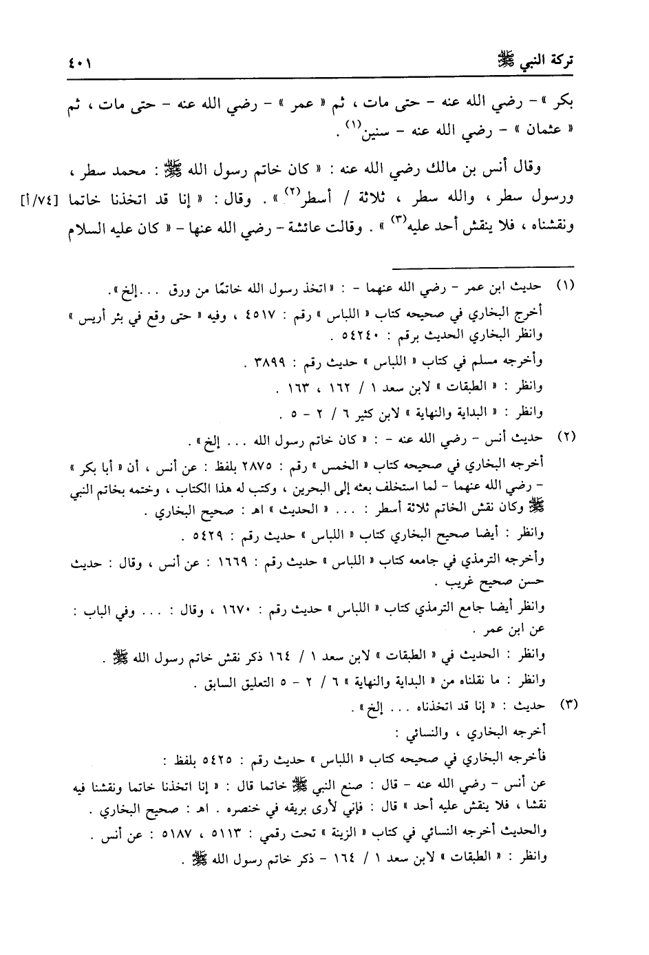 (2) حديث أنس- رضي الله عنه-: «كان خاتم رسول الله ... إلخ» . أخرجه البخاري في صحيحه كتاب «الخمس» رقم: 2875 بلفظ: عن أنس، أن «أبا بكر» - رضي الله عنهما- لما استخلف بعثه إلى البحرين، وكتب له هذا الكتاب، وختمه بخاتم النبي صلى الله عليه وسلّم وكان نقش الخاتم ثلاثة أسطر: ... «الحديث» اه: صحيح البخاري. وانظر: أيضا صحيح البخاري كتاب «اللباس» حديث رقم: 5429. وأخرجه الترمذي في جامعه كتاب «اللباس» حديث رقم: 1669: عن أنس، وقال: حديث حسن صحيح غريب. وانظر أيضا جامع الترمذي كتاب «اللباس» حديث رقم: 1670، وقال: ... وفي الباب: عن ابن عمر. وانظر: الحديث في «الطبقات» لابن سعد 1/ 164 ذكر نقش خاتم رسول الله صلى الله عليه وسلّم. وانظر: ما نقلناه من «البداية والنهاية» 6/ 2- 5 التعليق السابق.