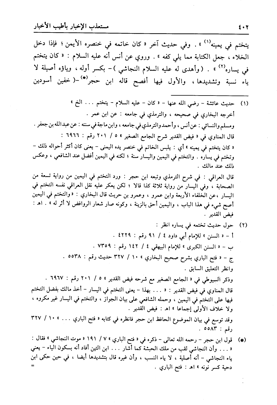 (1) حديث عائشة- رضي الله عنها- «كان- عليه السلام- يتختم ... الخ» . أخرجه البخاري في صحيحه، والترمذي في جامعه: عن ابن عمر. ومسلم والنسائي: عن أنس، وأحمد والترمذي في جامعه، وابن ماجة في سننه: عن عبد الله بن جعفر. قال المناوي في «فيض القدير شرح الجامع الصغير» 5/ 201 رقم: 6966: «كان يتختم في يمينه» أي: يلبس الخاتم في خنصر يده اليمنى- يعنى كان أكثر أحواله ذلك- وتختم في يساره. والتختم في اليمين واليسار سنة؛ لكنه في اليمين أفضل عند الشافعي، وعكس ذلك عند مالك. قال العراقي: في شرح الترمذي وتبعه ابن حجر: ورد التختم في اليمين من رواية تسعة من الصحابة، وفي اليسار من رواية ثلاثة كذا قالا؛ لكن يعكر عليه نقل العراقي نفسه التختم في اليسار، عن الخلفاء الأربعة وابن عمرو، وعمرو بن حريث قال البخاري: «والتختم في اليمين أصح شيء في هذا الباب، واليمين أحق بالزينة، وكونه صار شعار الروافض لا أثر له» . اه: فيض القدير.