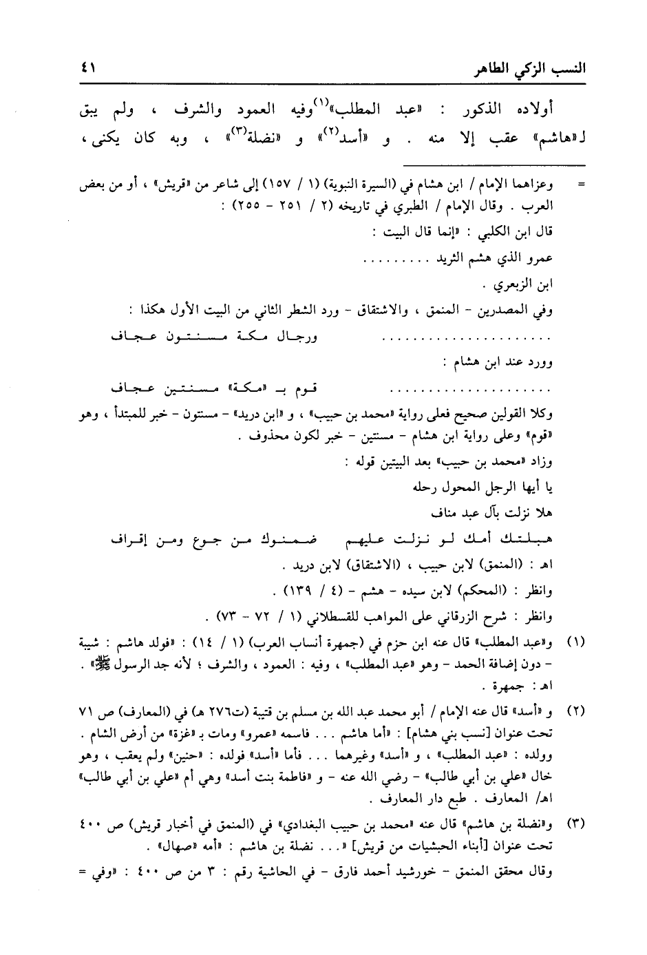 (1) و «عبد المطلب» قال عنه ابن حزم في (جمهرة أنساب العرب) (1/ 14) : «فولد هاشم: شيبة- دون إضافة الحمد- وهو «عبد المطلب» ، وفيه: العمود، والشرف؛ لأنه جد الرسول صلى الله عليه وسلّم. اه: جمهرة.