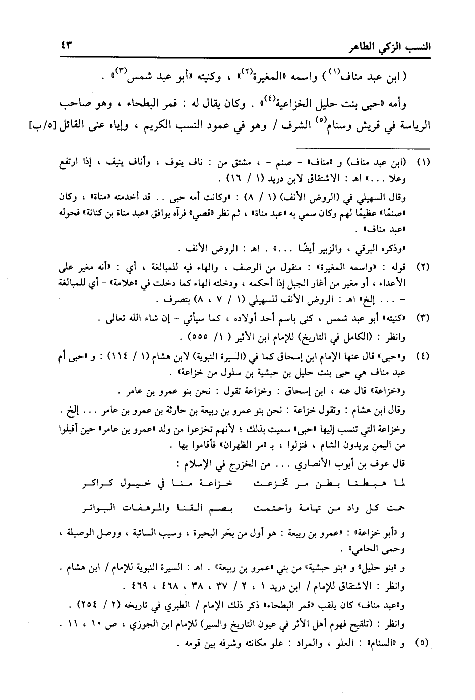 (1) (ابن عبد مناف) و «مناف» - صنم-، مشتق من: ناف ينوف، وأناف ينيف، إذا ارتفع وعلا ... » اه: الاشتقاق لابن دريد (1/ 16) . وقال السهيلي في (الروض الأنف) (1/ 8) : «وكانت أمه حبى.. قد أخدمته «مناة» ، وكان «صنما» عظيما لهم وكان سمي به «عبد مناة» ، ثم نظر «قصي» فرآه يوافق «عبد مناة بن كنانة» فحوله «عبد مناف» . «وذكره البرقي، والزبير أيضا ... » . اه: الروض الأنف.