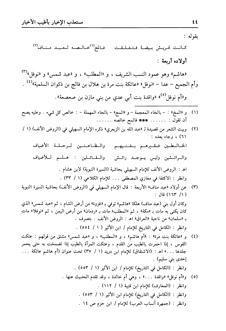 (3) عن أولاد «عبد مناف» الأربعة: قال الإمام السهيلي في (الروض الأنف) بحاشية السيرة النبوية (1/ 163) قال: وكان أول بني (عبد مناف) هلكا «هاشم» توفي ب «غزوة» من أرض الشام، ثم «عبد شمس» الذي كان يكنى به مات ب «مكة» ، ثم «المطلب» مات ب «ردمان» من أرض اليمن، ثم «نوفلا» مات ب «سلمان» من ناحية «العراق» اه: الروض الأنف. بتصرف. وانظر: الكامل في التاريخ للإمام/ ابن الأثير (1/ 554) .
