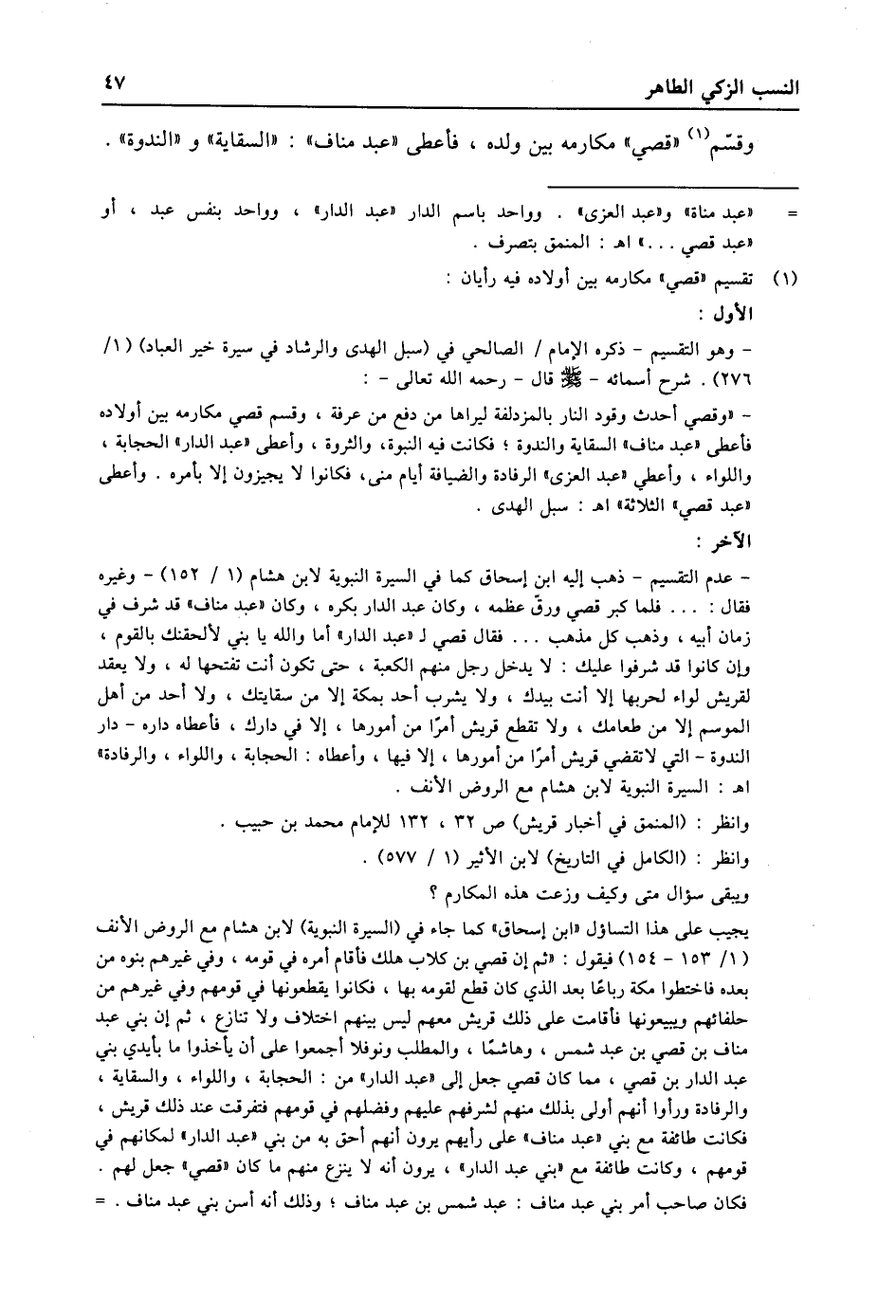 (1) تقسيم «قصي» مكارمه بين أولاده فيه رأيان: الأول: - وهو التقسيم- ذكره الإمام/ الصالحي في (سبل الهدى والرشاد في سيرة خير العباد) (1/ 276) . شرح أسمائه- صلى الله عليه وسلّم قال- رحمه الله تعالى-: - «وقصي أحدث وقود النار بالمزدلفة ليراها من دفع من عرفة، وقسم قصي مكارمه بين أولاده فأعطى «عبد مناف» السقاية والندوة؛ فكانت فيه النبوة، والثروة، وأعطى «عبد الدار» الحجابة، واللواء، وأعطي «عبد العزى» الرفادة والضيافة أيام منى، فكانوا لا يجيزون إلا بأمره. وأعطى «عبد قصي» الثلاثة» اه: سبل الهدى. الاخر: - عدم التقسيم- ذهب إليه ابن إسحاق كما في السيرة النبوية لابن هشام (1/ 152) - وغيره فقال: ... فلما كبر قصي ورقّ عظمه، وكان عبد الدار بكره، وكان «عبد مناف» قد شرف في زمان أبيه، وذهب كل مذهب ... فقال قصي ل «عبد الدار» أما والله يا بني لألحقنك بالقوم، وإن كانوا قد شرفوا عليك: لا يدخل رجل منهم الكعبة، حتى تكون أنت تفتحها له، ولا يعقد لقريش لواء لحربها إلا أنت بيدك، ولا يشرب أحد بمكة إلا من سقايتك، ولا أحد من أهل الموسم إلا من طعامك، ولا تقطع قريش أمرا من أمورها، إلا في دارك، فأعطاه داره- دار الندوة- التي لا تقضي قريش أمرا من أمورها، إلا فيها، وأعطاه: الحجابة، واللواء، والرفادة» اه: السيرة النبوية لابن هشام مع الروض الأنف. وانظر: (المنمق في أخبار قريش) ص 32، 132 للإمام محمد بن حبيب. وانظر: (الكامل في التاريخ) لابن الأثير (1/ 577) . ويبقى سؤال متى وكيف وزعت هذه المكارم؟ يجيب على هذا التساؤل «ابن إسحاق» كما جاء في (السيرة النبوية) لابن هشام مع الروض الأنف (1/ 153- 154) فيقول: «ثم إن قصي بن كلاب هلك فأقام أمره في قومه، وفي غيرهم بنوه من بعده فاختطوا مكة رباعا بعد الذي كان قطع لقومه بها، فكانوا يقطعونها في قومهم وفي غيرهم من حلفائهم ويبيعونها فأقامت على ذلك قريش معهم ليس بينهم اختلاف ولا تنازع، ثم إن بني عبد مناف بن قصي بن عبد شمس، وهاشما، والمطلب ونوفلا أجمعوا على أن يأخذوا ما بأيدي بني عبد الدار بن قصي، مما كان قصي جعل إلى «عبد الدار» من: الحجابة، واللواء، والسقاية، والرفادة ورأوا أنهم أولى بذلك منهم لشرفهم عليهم وفضلهم في قومهم فتفرقت عند ذلك قريش، فكانت طائفة مع بني «عبد مناف» على رأيهم يرون أنهم أحق به من بني «عبد الدار» لمكانهم في قومهم، وكانت طائفة مع «بني عبد الدار» ، يرون أنه لا ينزع منهم ما كان «قصي» جعل لهم. فكان صاحب أمر بني عبد مناف: عبد شمس بن عبد مناف؛ وذلك أنه أسن بني عبد مناف. -
