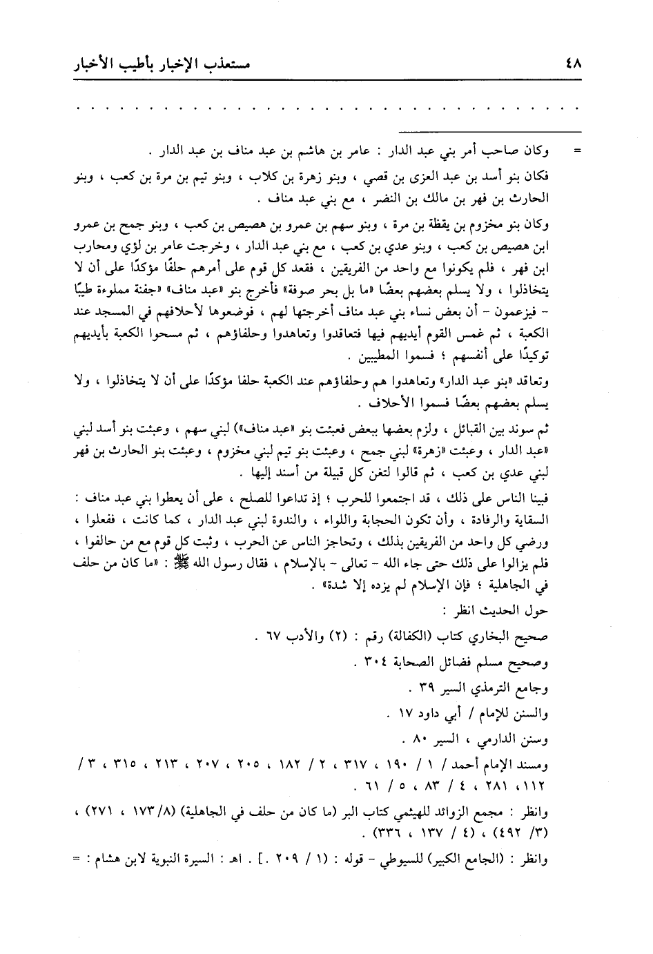 - وكان صاحب أمر بني عبد الدار: عامر بن هاشم بن عبد مناف بن عبد الدار. فكان بنو أسد بن عبد العزى بن قصي، وبنو زهرة بن كلاب، وبنو تيم بن مرة بن كعب، وبنو الحارث بن فهر بن مالك بن النضر، مع بني عبد مناف. وكان بنو مخزوم بن يقظة بن مرة، وبنو سهم بن عمرو بن هصيص بن كعب، وبنو جمح بن عمرو ابن هصيص بن كعب، وبنو عدي بن كعب، مع بني عبد الدار، وخرجت عامر بن لؤي ومحارب ابن فهر، فلم يكونوا مع واحد من الفريقين، فقعد كل قوم على أمرهم حلفا مؤكدا على أن لا يتخاذلوا، ولا يسلم بعضهم بعضا «ما بل بحر صوفة» فأخرج بنو «عبد مناف» «جفنة مملوءة طيبا- فيزعمون- أن بعض نساء بني عبد مناف أخرجتها لهم، فوضعوها لأحلافهم في المسجد عند الكعبة، ثم غمس القوم أيديهم فيها فتعاقدوا وتعاهدوا وحلفاؤهم، ثم مسحوا الكعبة بأيديهم توكيدا على أنفسهم؛ فسموا المطيبين. وتعاقد «بنو عبد الدار» وتعاهدوا هم وحلفاؤهم عند الكعبة حلفا مؤكدا على أن لا يتخاذلوا، ولا يسلم بعضهم بعضا فسموا الأحلاف. ثم سوند بين القبائل، ولزم بعضها ببعض فعبئت بنو «عبد مناف» ) لبني سهم، وعبئت بنو أسد لبني «عبد الدار، وعبئت «زهرة» لبني جمح، وعبئت بنو تيم لبني مخزوم، وعبئت بنو الحارث بن فهر لبني عدي بن كعب، ثم قالوا لتغن كل قبيلة من أسند إليها. فبينا الناس على ذلك، قد اجتمعوا للحرب؛ إذ تداعوا للصلح، على أن يعطوا بني عبد مناف: السقاية والرفادة، وأن تكون الحجابة واللواء، والندوة لبني عبد الدار، كما كانت، ففعلوا، ورضي كل واحد من الفريقين بذلك، وتحاجز الناس عن الحرب، وثبت كل قوم مع من حالفوا، فلم يزالوا على ذلك حتى جاء الله- تعالى- بالإسلام، فقال رسول الله صلى الله عليه وسلّم: «ما كان من حلف في الجاهلية؛ فإن الإسلام لم يزده إلا شدة» . حول الحديث انظر: صحيح البخاري كتاب (الكفالة) رقم: (2) والأدب 67. وصحيح مسلم فضائل الصحابة 304. وجامع الترمذي السير 39. والسنن للإمام/ أبي داود 17. وسنن الدارمي، السير 80. ومسند الإمام أحمد/ 1/ 190، 317، 2/ 182، 205، 207، 213، 315، 3/ 112، 281، 4/ 83، 5/ 61. وانظر: مجمع الزوائد للهيثمي كتاب البر (ما كان من حلف في الجاهلية) (8/ 173، 271) ، (3/ 492) ، (4/ 137، 336) . وانظر: (الجامع الكبير) للسيوطي- قوله: (1/ 209.] . اه: السيرة النبوية لابن هشام: -