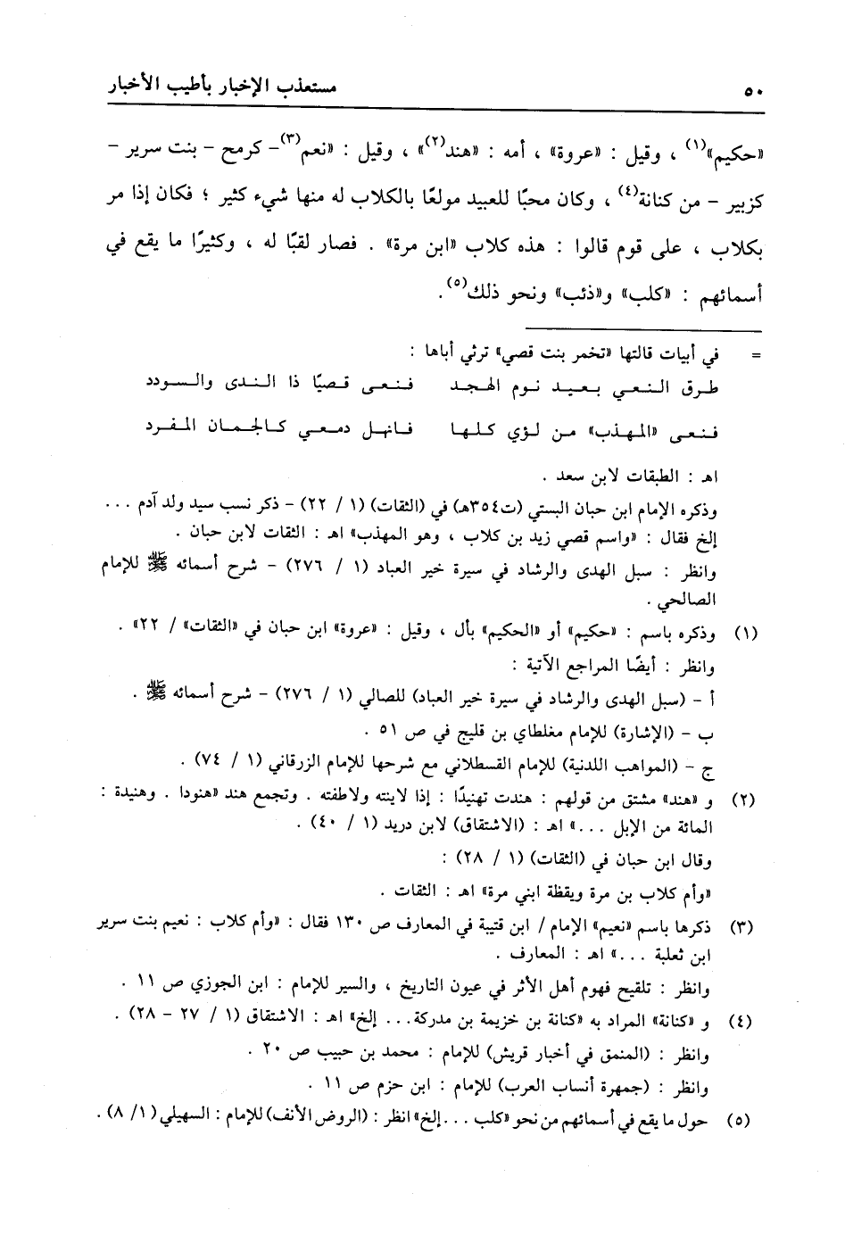 (3) ذكرها باسم «نعيم» الإمام/ ابن قتيبة في المعارف ص 130 فقال: «وأم كلاب: نعيم بنت سرير ابن ثعلبة ... » اه: المعارف. وانظر: تلقيح فهوم أهل الأثر في عيون التاريخ، والسير للإمام: ابن الجوزي ص 11.