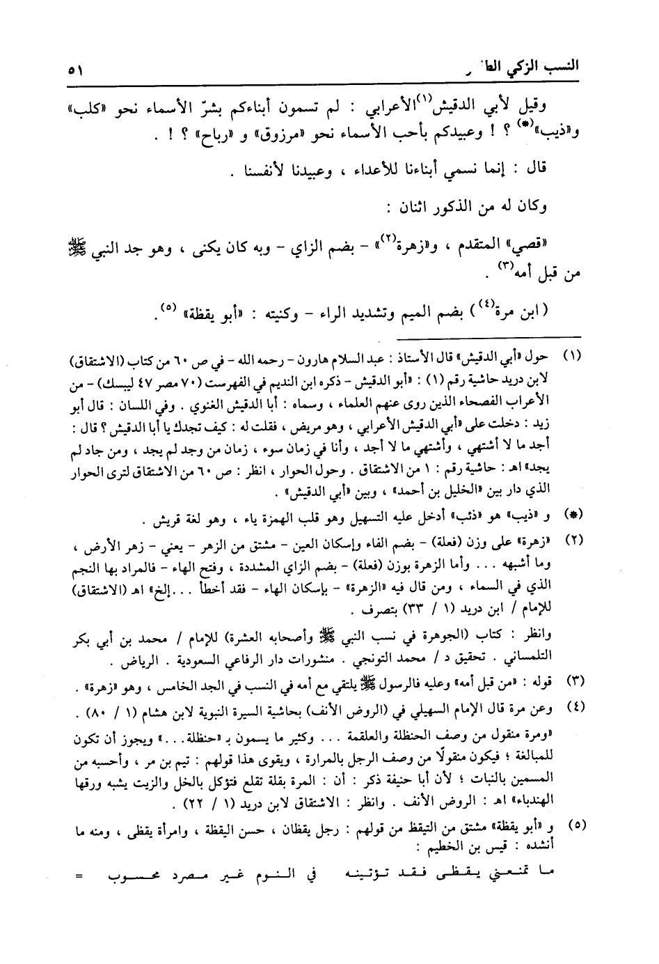(2) «زهرة» على وزن (فعلة) - بضم الفاء وإسكان العين- مشتق من الزهر- يعني- زهر الأرض، وما أشبهه ... وأما الزهرة بوزن (فعلة) - بضم الزاي المشددة، وفتح الهاء- فالمراد بها النجم الذي في السماء، ومن قال فيه «الزهرة» - بإسكان الهاء- فقد أخطأ ... إلخ» اه (الاشتقاق) للإمام/ ابن دريد (1/ 33) بتصرف. وانظر: كتاب (الجوهرة في نسب النبي صلى الله عليه وسلّم وأصحابه العشرة) للإمام/ محمد بن أبي بكر التلمساني. تحقيق د/ محمد التونجي. منشورات دار الرفاعي السعودية. الرياض.