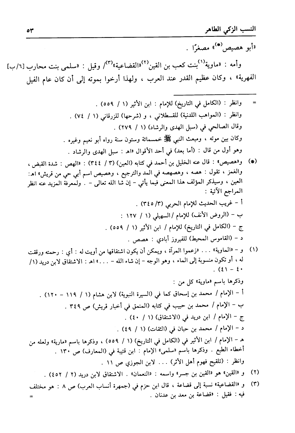 (*) و «هصيص» : قال عنه الخليل بن أحمد في كتابه (العين) (3/ 344) : «الهص: شدة القبض، والغمز، تقول: هصه، وهصهصه في المد والترجيع، وهصيص اسم أبي حي من قريش» اه: العين، وسيذكر المؤلف هذا المعنى فيما يأتي- إن شاء الله تعالى-. ولمعرفة المزيد عنه انظر المراجع الاتية: أ- غريب الحديث للإمام الحربي (3/ 345) . ب- (الروض الأنف) للإمام/ السهيلي (1/ 127: ج- (الكامل في التاريخ) للإمام/ ابن الأثير (1/ 559) . د- (القاموس المحيط) للفيروز أبادي: هصص.