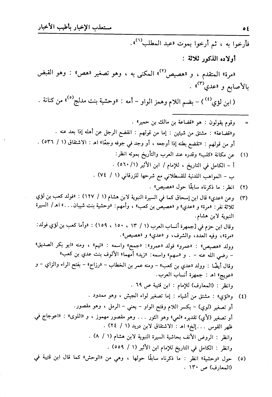 (3) وعن «عدي» قال ابن إسحاق كما في السيرة النبوية لابن هشام (1/ 127) : «فولد كعب بن لؤي ثلاثة نفر: «مرة» و «عدي» و «هصيص بن كعب» ، وأمهم: «وحشية بنت شيبان ... » اه/ السيرة النبوية لابن هشام. وقال ابن حزم في [جمهرة أنساب العرب (1/ 13، 150، 159) : «وأما كعب بن لؤي فولد: «مرة» ، وفيه العدد، والشرف، و «عدي» و «هصيص» . وولد «هصيص» : «عمرو» فولد «عمرو» : «جمح» واسمه: «تيم» ، ومنه «ابو بكر الصديق» - رضي الله عنه-. و «سهم» واسمه: «زيد» أمهما» الألوف بنت عدي بن كعب» . وقال أيضا: وولد «عدي بن كعب» - ومنه عمر بن الخطاب- «رزاح» - بفتح الراء والزاي- و «عويج» اه: جمهرة أنساب العرب. وانظر: (المعارف) للإمام: ابن قتيبة ص 69.