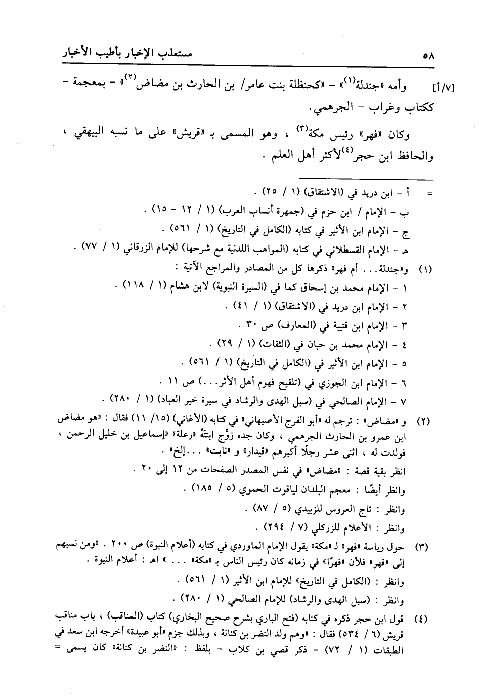 (1) و «جندلة ... أم فهر» ذكرها كل من المصادر والمراجع الاتية: 1- الإمام محمد بن إسحاق كما في (السيرة النبوية) لابن هشام (1/ 118) . 2- الإمام ابن دريد في (الاشتقاق) (1/ 41) . 3- الإمام ابن قتيبة في (المعارف) ص 30. 4- الإمام محمد بن حبان في (الثقات) (1/ 29) . 5- الإمام ابن الأثير في (الكامل في التاريخ) (1/ 561) . 6- الإمام ابن الجوزي في (تلقيح فهوم أهل الأثر ... ) ص 11. 7- الإمام الصالحي في (سبل الهدى والرشاد في سيرة خير العباد) (1/ 280) .