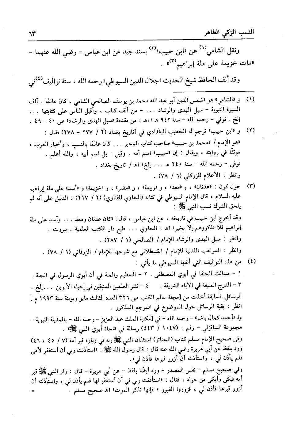 (3) حول كون: «عدنان» ، و «معد» ، و «ربيعة» ، و «مضر» ، و «خزيمة» و «أسد» على ملة إبراهيم عليه السلام، قال الإمام السيوطي في كتابه (الحاوي للفتاوي) (2/ 217) : الدليل على أنه لم يلحق الشرك نسب النبي صلى الله عليه وسلّم: وقد أخرج ابن حبيب في تاريخه، عن ابن عباس، قال: «كان عدنان ومعد ... وأسد على ملة إبراهيم فلا تذكروهم إلا بخير» اه: الحاوي ... طبع دار الكتب العلمية. بيروت. وانظر: سبل الهدى والرشاد للإمام/ الصالحي (1/ 287) . وانظر: المواهب اللدنية للإمام/ القسطلاني مع شرحها للإمام/ الزرقاني (1/ 78) .