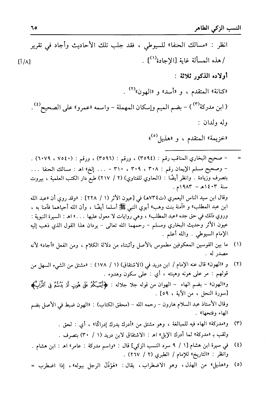 (4) في سيرة ابن هشام [1/ 9 سرد النسب الزكي] قال: «واسم مدركة: عامر» اه: ابن هشام. وانظر: «التاريخ» للإمام/ الطبري (2/ 267) .