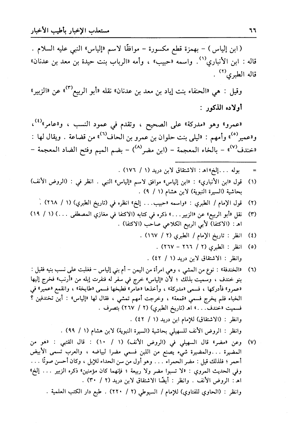 (7) وعن «مضر» قال السهيلي في (الروض الأنف) (1/ 10) : قال القتبي: «هو من المضيرة ... والمضيرة شيء يصنع من اللبن فسمي مضرا لبياضه، والعرب تسمى الأبيض أحمر؛ فلذلك قيل: مضر الحمراء ... وهو أول من سن الحداء للإبل، وكان أحسن صوتا ... وفي الحديث المروي: «لا تسبوا مضر ولا ربيعة؛ فإنهما كان مؤمنين» ذكره الزبير ... إلخ» اه: الروض الأنف. وانظر: أيضا الاشتقاق لابن دريد (2/ 30) .