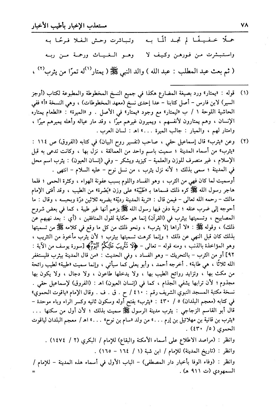 (2) وعن «يثرب» قال إسماعيل حقي، صاحب (تفسير روح البيان) في كتابه (الفروق) ص 114: «يثرب» من أسماء المدينة؛ سميت باسم واحد من العمالقة، نزل بها، وكانت تدعى به قبل الإسلام، غير منصرف للوزن والعلمية- كيزيد ويشكر- وفي (إنسان العيون) : يثرب اسم محل في المدينة؛ سمى بذلك؛ لأنه نزل يثرب، من نسل نوح- عليه السلام- انتهى. أو سميت لما كان فهي من الثرب، وهو الفساد واللوم بسبب عفونة الهواء، وكثرة الحمى؛ فلما هاجر رسول الله صلى الله عليه وسلّم كره ذلك فسماها ب «طيّبة» على وزن «بصرة» من الطيب، وقد أفتى الإمام مالك- رحمه الله تعالى- فيمن قال: «تربة المدينة رديّة» بضربه ثلاثين درّة وبحبسه، وقال: ما أحوجه إلى ضرب عنقه؛ تربة دفن فيها رسول الله صلى الله عليه وسلّم يزعم أنها غير طيبة، كما في بعض شروح المصابيح، وتسميتها بيثرب في (القرآن) إنما هو حكاية لقول المنافقين، (أي: بعد نهيهم عن ذلك) ، وقوله صلى الله عليه وسلّم: «لا أراها إلا يثرب» ، ونحو ذلك من كل ما وقع في كلامه صلى الله عليه وسلّم من تسميتها بذلك كان قبل النهي عن ذلك؛ وإنما كرهت تسميتها بيثرب؛ لأن يثرب مأخوذ من التثريب، وهو المؤاخذة بالذنب، ومنه قوله- تعالى- لا تَثْرِيبَ عَلَيْكُمُ الْيَوْمَ [سورة يوسف من الاية: 92] أو من الثرب- بالتحريك- وهو الفساد، وفي الحديث: «من قال المدينة بيثرب فليستغفر الله ثلاثا، هي طابة» . أخرجه أحمد، وأبو يعلى كما سيأتي، وإنما سميت «طيبة» لطيف رائحة من مكث بها، وتزايد روائح الطيب بها، ولا يدخلها طاعون، ولا دجال، ولا يكون بها مجذوم؛ لأن ترابها يشفي الجذام، كما في (إنسان العيون) اه: (الفروق) لإسماعيل حقي. نسخة مكتبة المسجد النبوي الشريف رقم: 410/ ح. ق. ف. وقال الإمام «ياقوت الحموي» في كتابه (معجم البلدان) 5/ 430: «يثرب» بفتح أوله وسكون ثانيه وكسر الراء وباء موحدة- قال أبو القاسم الزجاجي: يثرب مدينة الرسول صلى الله عليه وسلّم سميت بذلك؛ لأن أول من سكنها ... «يثرب بن قانية بن مهلائيل بن إرم ... » من ولد «سام بن نوح» ... » اه/ معجم البلدان لياقوت الحموي (5/ 430) . وانظر: (مراصد الاطلاع على أسماء الأمكنة والبقاع) للإمام/ البكري (2/ 1474) . وانظر: (تاريخ المدينة) للإمام/ ابن شبة (1/ 164- 165) . وانظر: (وفاء الوفا بأخبار دار المصطفى) - الباب الأول في أسماء هذه المدينة- للإمام/ السمهودي (ت 911 هـ) .