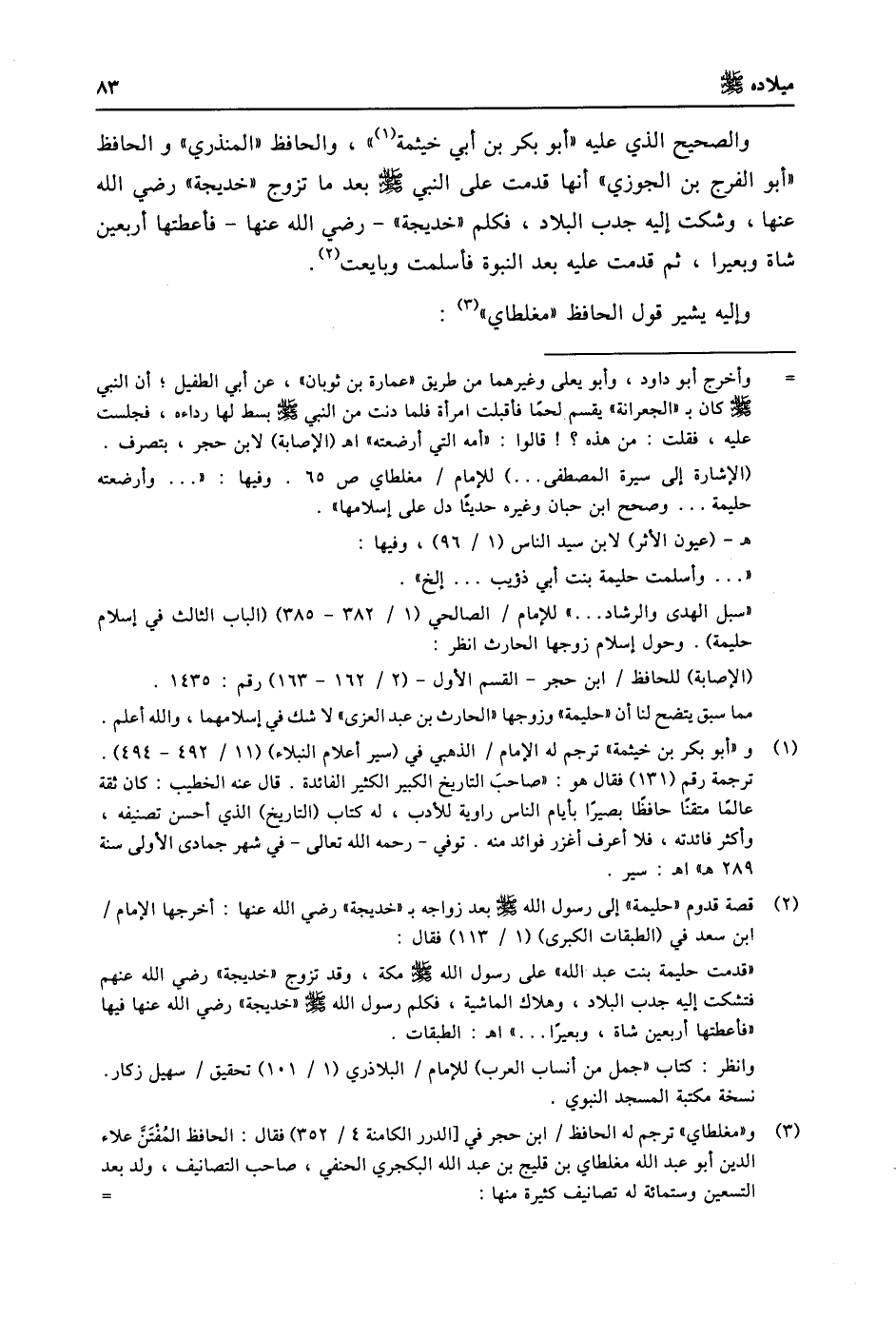 (2) قصة قدوم «حليمة» إلى رسول الله صلى الله عليه وسلّم بعد زواجه ب «خديجة» رضي الله عنها: أخرجها الإمام/ ابن سعد في (الطبقات الكبرى) (1/ 113) فقال: «قدمت حليمة بنت عبد الله» على رسول الله صلى الله عليه وسلّم مكة، وقد تزوج «خديجة» رضي الله عنهم فتشكت إليه جدب البلاد، وهلاك الماشية، فكلم رسول الله صلى الله عليه وسلّم «خديجة» رضي الله عنها فيها «فأعطتها أربعين شاة، وبعيرا ... » اه: الطبقات. وانظر: كتاب «جمل من أنساب العرب) للإمام/ البلاذري (1/ 101) تحقيق/ سهيل زكار. نسخة مكتبة المسجد النبوي.