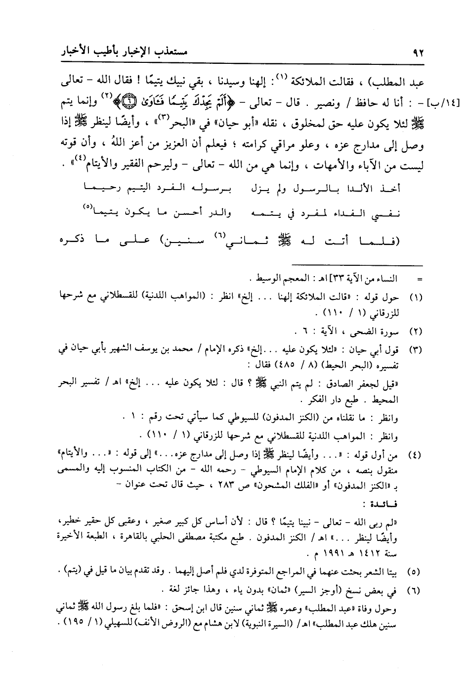 (3) قول أبي حيان: «لئلا يكون عليه ... إلخ» ذكره الإمام/ محمد بن يوسف الشهير بأبي حيان في تفسيره (البحر الحيط) (8/ 485) فقال: «قيل لجعفر الصادق: لم يتم النبي صلى الله عليه وسلّم؟ قال: لئلا يكون عليه ... إلخ» اه/ تفسير البحر المحيط. طبع دار الفكر. وانظر: ما نقلناه من (الكنز المدفون) للسيوطي كما سيأتي تحت رقم: 1. وانظر: المواهب اللدنية للقسطلاني مع شرحها للزرقاني (1/ 110) .