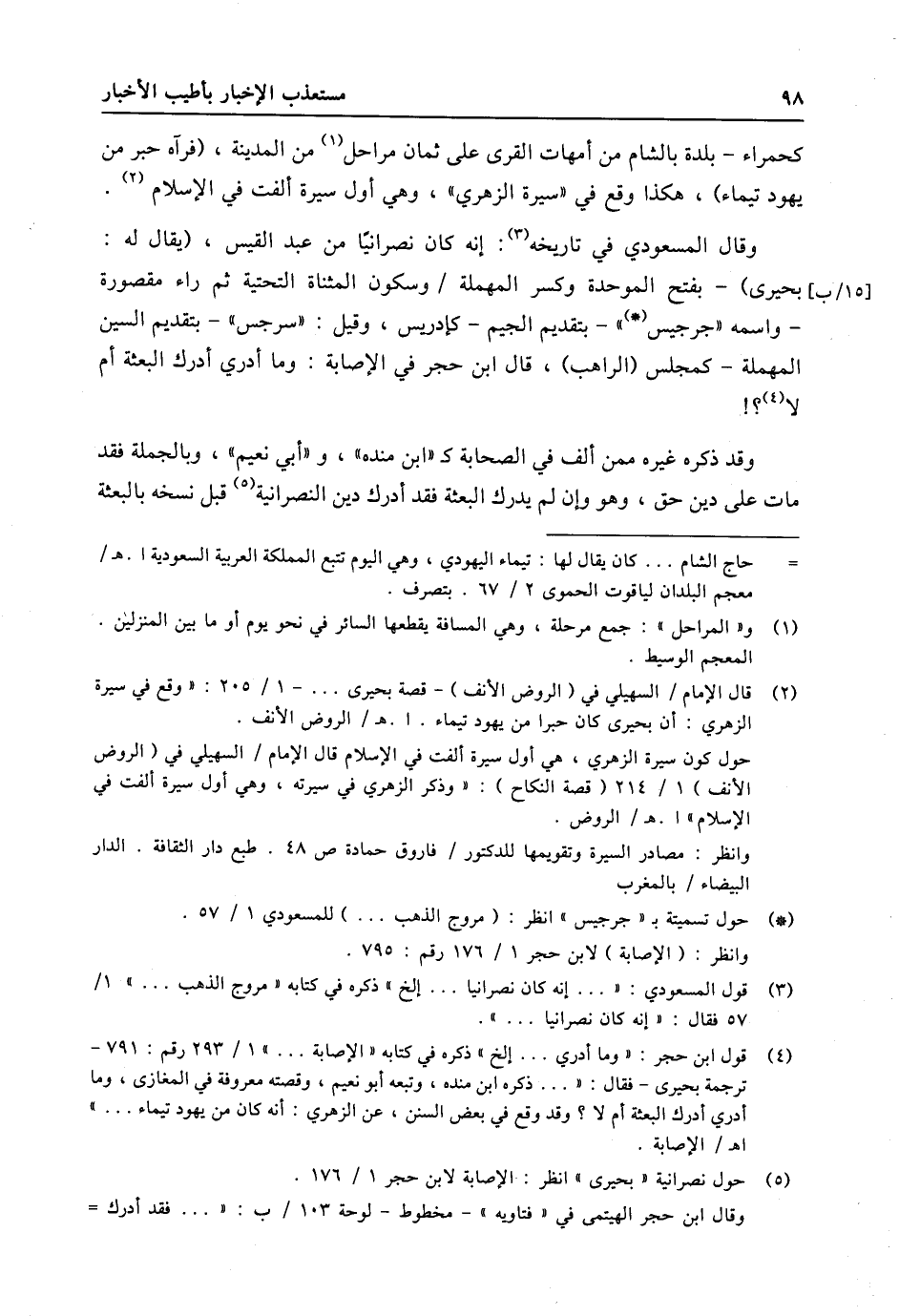 (4) قول ابن حجر: «وما أدري ... إلخ» ذكره في كتابه «الإصابة ... » 1/ 293 رقم: 791- ترجمة بحيرى- فقال: « ... ذكره ابن منده، وتبعه أبو نعيم، وقصته معروفة في المغازي، وما أدري أدرك البعثة أم لا؟ وقد وقع في بعض السنن، عن الزهري: أنه كان من يهود تيماء ... » اه/ الإصابة.