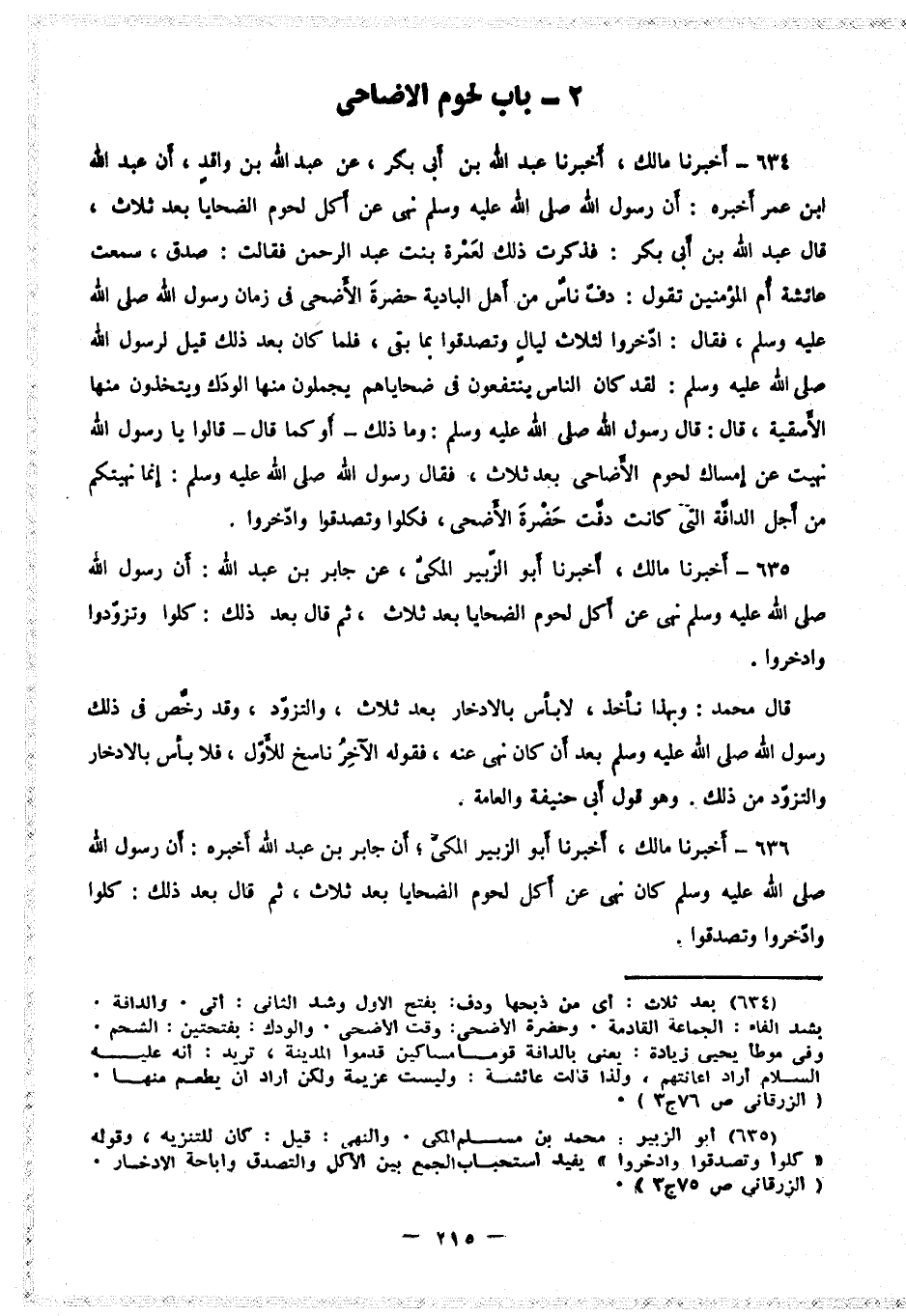 ٦٣٥ - أَخْبَرَنَا مَالِكٌ، أَخْبَرَنَا أَبُو الزُّبَيْرِ الْمَكِّيُّ، عَنْ جَابِرِ بْنِ عَبْدِ اللَّهِ أَنَّهُ أَخْبَرَهُ، أَنَّ رَسُولَ اللَّهِ صَلَّى اللَّهُ عَلَيْهِ وَسَلَّمَ «نَهَى عَنْ أَكْلِ لُحُومِ الضَّحَايَا بَعْدَ ثَلاثٍ» ، ثُمَّ قَالَ بَعْدَ ذَلِكَ: «كُلُوا وَتَزَوَّدُوا وَادَّخِرُوا» ، قَالَ مُحَمَّدٌ: وَبِهَذَا نَأْخُذُ، لا بَأْسَ بِالادِّخَارِ بَعْدَ ثَلاثٍ وَالتَّزَوُّدِ، وَقَدْ رَخَّصَ فِي ذَلِكَ رَسُولُ اللَّهِ صَلَّى اللَّهُ عَلَيْهِ وَسَلَّمَ بَعْدَ أَنْ كَانَ نَهَى عَنْهُ، فَقَوْلُهُ الآخَرُ نَاسِخٌ لِلأَوَّلِ، فَلا بَأْسَ بِالادِّخَارِ وَالتَّزَوُّدِ مِنْ ذَلِكَ، وَهُوَ قَوْلُ أَبِي حَنِيفَةَ، وَالْعَامَّةِ مِنْ فُقَهَائِنَا