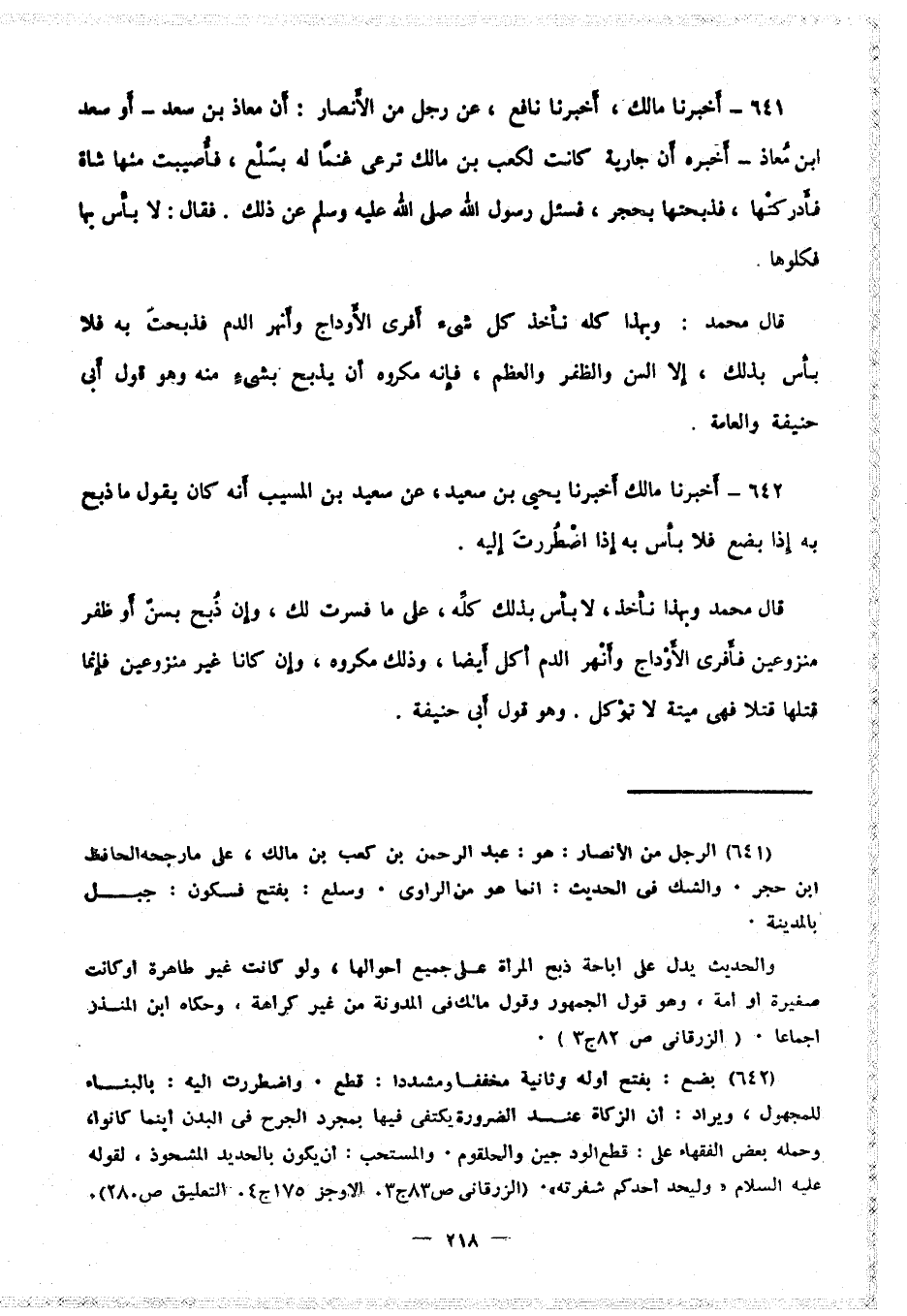 ٦٤١ - أَخْبَرَنَا مَالِكٌ، أَخْبَرَنَا نَافِعٌ، عَنْ رَجُلٍ مِنَ الأَنْصَارِ، أَنَّ مُعَاذَ بْنَ سَعْدٍ، أَوْ سَعْدَ بْنَ مُعَاذٍ أَخْبَرَهُ، أَنَّ جَارِيَةً لِكَعْبِ بْنِ مَالِكٍ كَانَتْ تَرْعَى غَنَمًا لَهُ بِسَلْعٍ فَأُصِيبَتْ مِنْهَا شَاةٌ، فَأَدْرَكَتْهَا، ثُمَّ ذَبَحَتْهَا بِحَجَرٍ، فَسُئِلَ رَسُولُ اللَّهِ صَلَّى اللَّهُ عَلَيْهِ وَسَلَّمَ عَنْ ذَلِكَ فَقَالَ: لا بَأْسَ بِهَا كُلُوهَا "، قَالَ مُحَمَّدٌ: وَبِهَذَا نَأْخُذُ، كُلُّ شَيْءٍ أَفْرَى الأَوْدَاجَ وَأَنْهَرَ الدَّمَ فَذَبَحْتَ بِهِ فَلا بَأْسَ بِذَلِكَ إِلا السِّنَّ وَالظُّفْرَ وَالْعَظْمَ، فَإِنَّهُ مَكْرُوهٌ أَنْ تَذْبَحَ بِشَيْءٍ مِنْهُ، وَهُوَ قَوْلُ أَبِي حَنِيفَةَ، وَالْعَامَّةِ مِنْ فُقَهَائِنَا