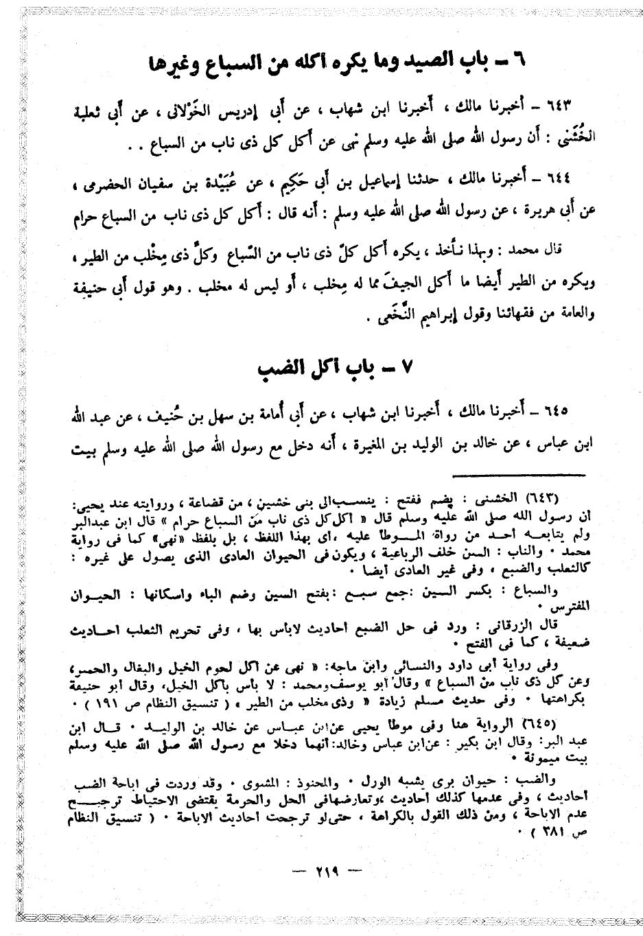 ٦٤٤ - أَخْبَرَنَا مَالِكٌ، حدّثنَا إِسْمَاعِيلُ بْنُ أَبِي حَكِيمٍ، عَنْ عَبِيدَةَ بْنِ سُفْيَانَ الْحَضْرَمِيِّ، عَنْ أَبِي هُرَيْرَةَ، عَنْ رَسُولِ اللَّهِ صَلَّى اللَّهُ عَلَيْهِ وَسَلَّمَ أَنَّهُ قَالَ: «أكْلُ كُلِّ ذِي نَابٍ مِنَ السِّبَاعِ حَرَامٌ» ، قَالَ مُحَمَّدٌ: وَبِهَذَا نَأْخُذُ، يُكْرَهُ أَكْلُ كُلِّ ذِي نَابٍ مِنَ السِّبَاعِ، وَكُلِّ ذِي مِخْلَبٍ مِنَ الطَّيْرِ، وَيُكْرَهُ مِنَ الطَّيْرِ أَيْضًا مَا يَأْكُلُ الْجِيَفَ مِمَّا لَهُ مِخْلَبٌ، أَوْ لَيْسَ لَهُ مِخْلَبٌ، وَهُوَ قَوْلُ أَبِي حَنِيفَةَ، وَالْعَامَّةِ مِنْ فُقَهَائِنَا، وَإِبْرَاهِيمَ النَّخَعِيِّ
