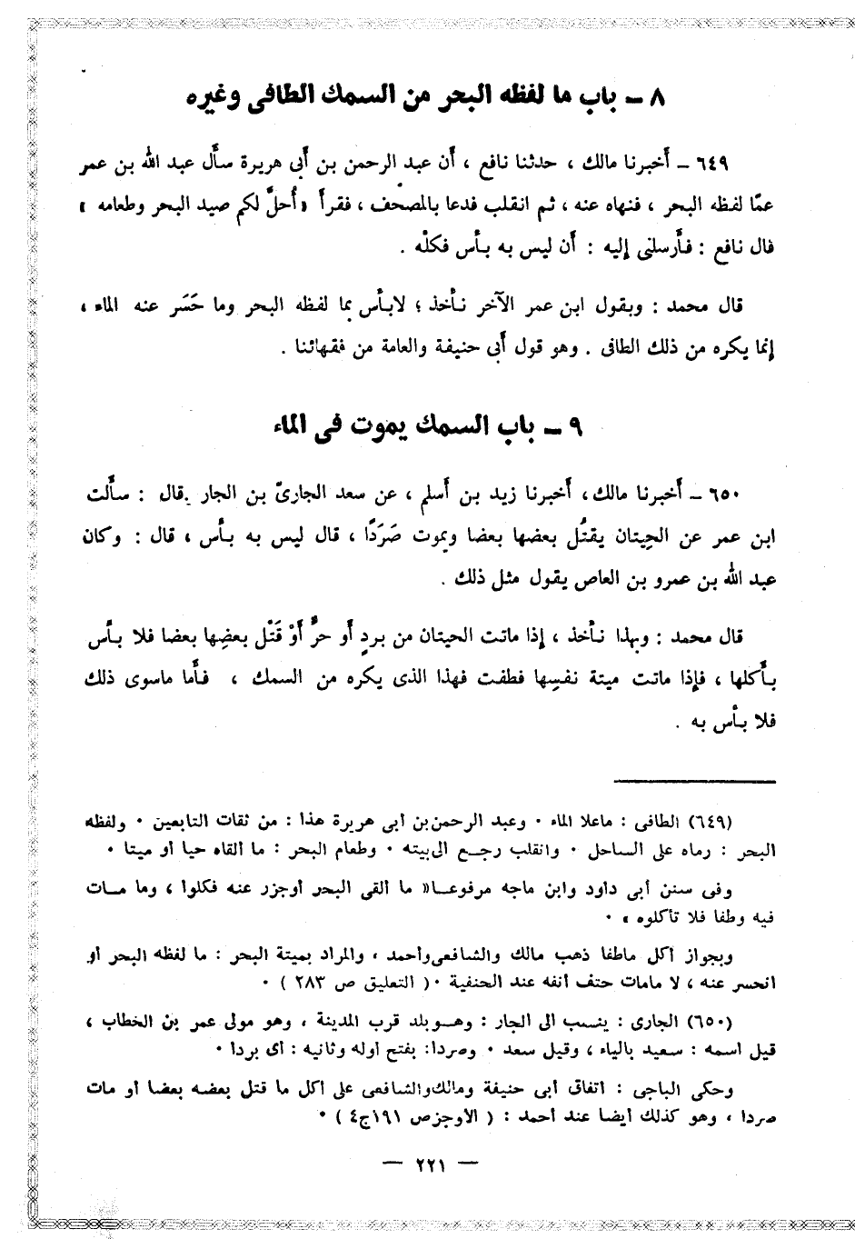 ٦٤٩ - أَخْبَرَنَا مَالِكٌ، حَدَّثَنَا نَافِعٌ، أَنَّ ابْنَ عَبْدِ الرَّحْمَنِ بْنِ أَبِي هُرَيْرَةَ، سَأَلَ عَبْدَ اللَّهِ بْنَ عُمَرَ " عَمَّا لَفَظَهُ الْبَحْرُ؟ فَنَهَاهُ عَنْهُ، ثُمَّ انْقَلَبَ فَدَعَا بِمُصْحَفٍ فَقَرَأَ: {أُحِلَّ لَكُمْ صَيْدُ الْبَحْرِ وَطَعَامُهُ} [المائدة: ٩٦] "، قَالَ نَافِعٌ: فَأَرْسَلَنِي إِلَيْهِ أنْ لَيْسَ بِهِ بَأْسٌ فَكُلْهُ، قَالَ مُحَمَّدٌ: وَبِقَوْلِ ابْنِ عُمَرَ الآخِرِ نَأْخُذُ، لا بَأْسَ بِمَا لَفَظَهُ الْبَحْرُ وَبِمَا حَسَرَ عَنْهُ الْمَاءُ إِنَّمَا يُكْرَهُ مِنْ ذَلِكَ الطَّافِي، وَهُوَ قَوْلُ أَبِي حَنِيفَةَ، وَالْعَامَّةِ مِنْ فُقَهَائِنَا رَحِمَهُمُ اللَّهُ