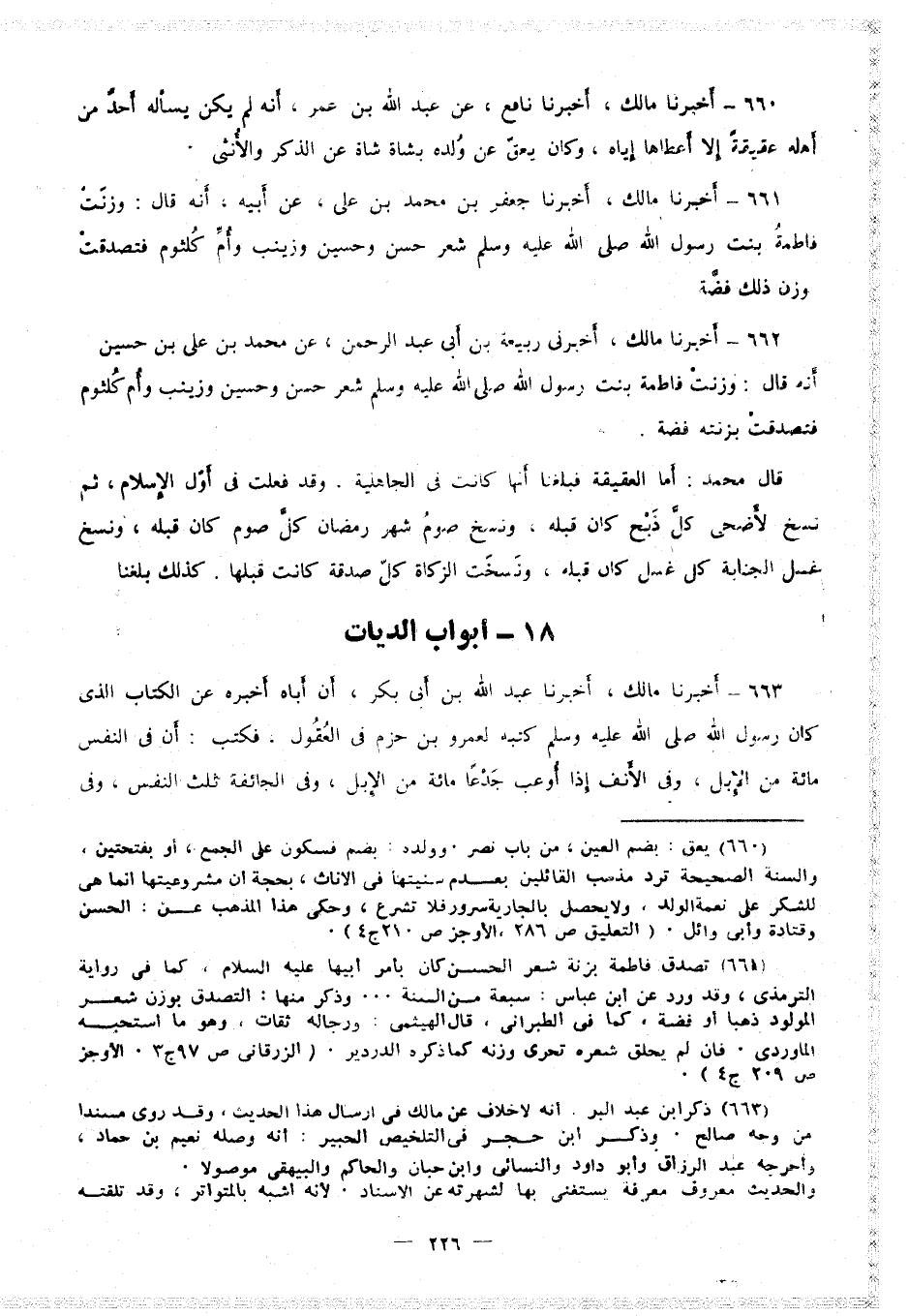 ٦٦٢ - أَخْبَرَنَا مَالِكٌ، أَخْبَرَنِي رَبِيعَةُ بْنُ أَبِي عَبْدِ الرَّحْمَنِ، عَنْ مُحَمَّدِ بْنِ عَلِيِّ بْنِ حُسَيْنٍ، أَنَّهُ قَالَ: «وَزَنَتْ فَاطِمَةُ بِنْتُ رَسُولِ اللَّهِ صَلَّى اللَّهُ عَلَيْهِ وَسَلَّمَ شَعْرَ حَسَنٍ، وَحُسَيْنٍ، فَتَصَدَّقَتْ بِوَزْنِهِ فِضَّةً» ، قَالَ مُحَمَّدٌ: أَمَّا الْعَقِيقَةُ فَبَلَغَنَا أَنَّهَا كَانَتْ فِي الْجَاهِلِيَّةِ، وَقَدْ فُعِلَتْ فِي أَوَّلِ الإِسْلامِ ثُمَّ نَسَخَ الأَضْحَى كُلَّ ذَبْحٍ كَانَ قَبْلَهُ، وَنَسَخَ صَوْمُ شَهْرِ رَمَضَانَ كُلَّ صَوْمٍ كَانَ قَبْلَهُ، وَنَسَخَ غُسْلُ الْجَنَابَةِ كُلَّ غُسْلٍ كَانَ قَبْلَهُ، وَنَسَخَتِ الزَّكَاةُ كُلَّ صَدَقَةٍ كَانَتْ قَبْلَهَا، كَذَلِكَ بَلَغَنَا
