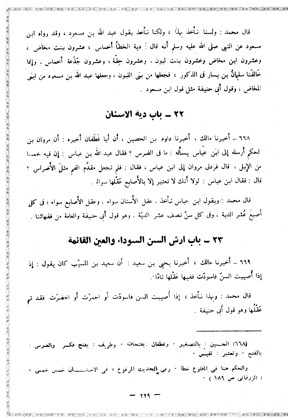 ٦٦٨ - أَخْبَرَنَا مَالِكٌ، أَخْبَرَنَا دَاوُدُ بْنُ الْحُصَيْنِ، أَنَّ أَبَا غَطَفَانَ أَخْبَرَهُ، أَنَّ مَرْوَانَ بْنَ الْحَكَمِ أَرْسَلَهُ إِلَى ابْنِ عَبَّاسٍ يَسْأَلُهُ مَا فِي الضِّرْسِ؟ فَقَالَ: إِنَّ فِيهِ خَمْسًا مِنَ الإِبِلِ، قَالَ: فَرَدَّنِي مَرْوَانُ إِلَى ابْنِ عَبَّاسٍ، فَقَالَ: فَلِمَ تَجْعَلُ مُقَدَّمَ الْفَمِ مِثْلَ الأَضْرَاسِ؟ قَالَ: فَقَالَ ابْنُ عَبَّاسٍ: لَوْلا أَنَّكَ لا تَعْتَبِرُ إِلا بِالأَصَابِعِ عَقْلُهَا سَوَاءٌ، قَالَ مُحَمَّدٌ: وَبِقَوْلِ ابْنِ عَبَّاسٍ نَأْخُذُ، عَقْلُ الأَسْنَانِ سَوَاءٌ، وَعَقْلُ الأَصَابِعِ سَوَاءٌ، فِي كُلِّ إِصْبَعٍ عُشْرٌ مِنَ الدِّيَةِ، وَفِي كُلِّ سِنٍّ نِصْفُ عُشْرٍ مِنَ الدِّيَةِ، وَهُوَ قَوْلُ أَبِي حَنِيفَةَ، وَالْعَامَّةِ مِنْ فُقَهَائِنَا