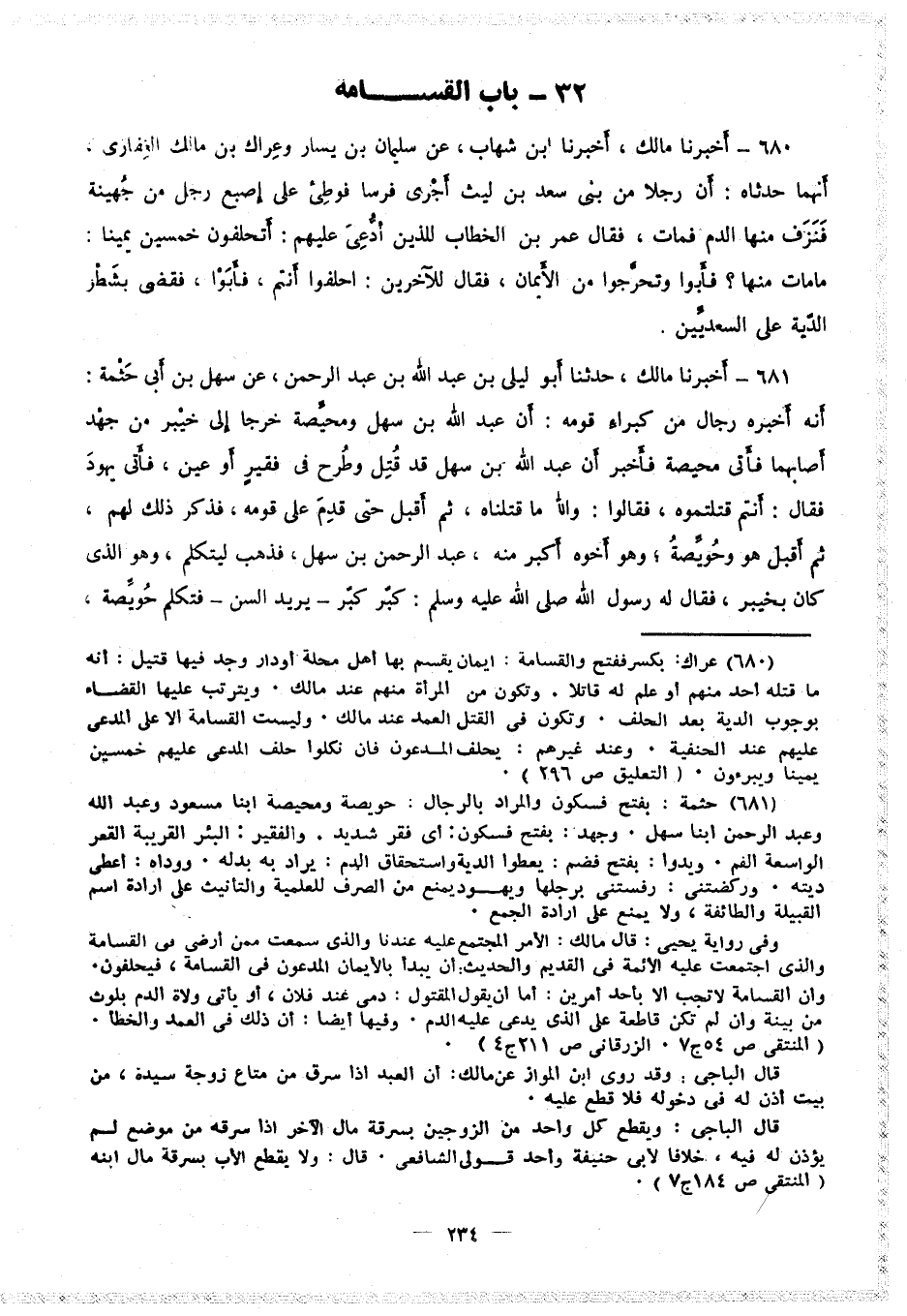 ٦٨١ - أَخْبَرَنَا مَالِكٌ، حَدَّثَنَا أَبُو لَيْلَى بْنُ عَبْدِ اللَّهِ بْنِ عَبْدِ الرَّحْمَنِ، عَنْ سَهْلِ بْنِ أَبِي حَثْمَةَ، أَنَّهُ أَخْبَرَهُ رِجَالٌ مِنْ كُبَرَاءِ قَوْمِهِ، أَنَّ عَبْدَ اللَّهِ بْنَ سَهْلٍ، وَمُحَيِّصَةَ خَرَجَا إِلَى خَيْبَرَ مِنْ جَهْدٍ أَصَابَهُمَا، فَأُتِيَ مُحَيِّصَةُ، فَأُخْبِرَ أَنَّ عَبْدَ اللَّهِ بْنَ سَهْلٍ قَدْ قُتِلَ، وَطُرِحَ فِي فَقِيرٍ، أَوْ عَيْنٍ، فَأَتَى يَهُودَ، فَقَالَ: أَنْتُمْ قَتَلْتُمُوهُ؟ فَقَالُوا: وَاللَّهِ مَا قَتَلْنَاهُ، ثُمَّ أَقْبَلَ حَتَّى قَدِمَ عَلَى قَوْمِهِ، فَذَكَرَ ذَلِكَ لَهُمْ، ثُمَّ أَقْبَلَ هُوَ وَحُوَيِّصَةُ، وَهُوَ أَخُوهُ أَكْبَرُ مِنْهُ، وَعَبْدُ الرَّحْمَنِ بْنُ سَهْلٍ، فَذَهَبَ لِيَتَكَلَّمَ، وَهُوَ الَّذِي كَانَ بِخَيْبَرَ، فَقَالَ لَهُ رَسُولُ اللَّهِ صَلَّى اللَّهُ عَلَيْهِ وَسَلَّمَ: «كَبِّرْ كَبِّرْ» ، يُرِيدُ السِّنَّ، فَتَكَلَّمَ حُوَيِّصَةُ، ⦗٢٣٥⦘ ثُمَّ تَكَلَّمَ مُحَيِّصَةُ، فَقَالَ رَسُولُ اللَّهِ صَلَّى اللَّهُ عَلَيْهِ وَسَلَّمَ: «إِمَّا أَنْ يَدُوا صَاحِبَكُمْ، وَإِمَّا أَنْ يُؤْذَنُوا بِحَرْبٍ» ، فَكَتَبَ إِلَيْهِمْ رَسُولُ اللَّهِ صَلَّى اللَّهُ عَلَيْهِ وَسَلَّمَ فِي ذَلِكَ، فَكَتَبُوا لَهُ: إِنَّا وَاللَّهِ مَا قَتَلْنَاهُ، فَقَالَ رَسُولُ اللَّهِ صَلَّى اللَّهُ عَلَيْهِ وَسَلَّمَ لِحُوَيِّصَةَ، وَمُحَيِّصَةَ، وَعَبْدِ الرَّحْمَنِ: «تَحْلِفُونَ وَتَستَحِقُّونَ دَمَ صَاحِبِكُمْ» ، قَالُوا: لا، قَالَ: «فَتَحْلِفُ لَكُمْ يَهُودُ» ، قَالُوا: لا، لَيْسُوا بِمُسْلِمِينَ.