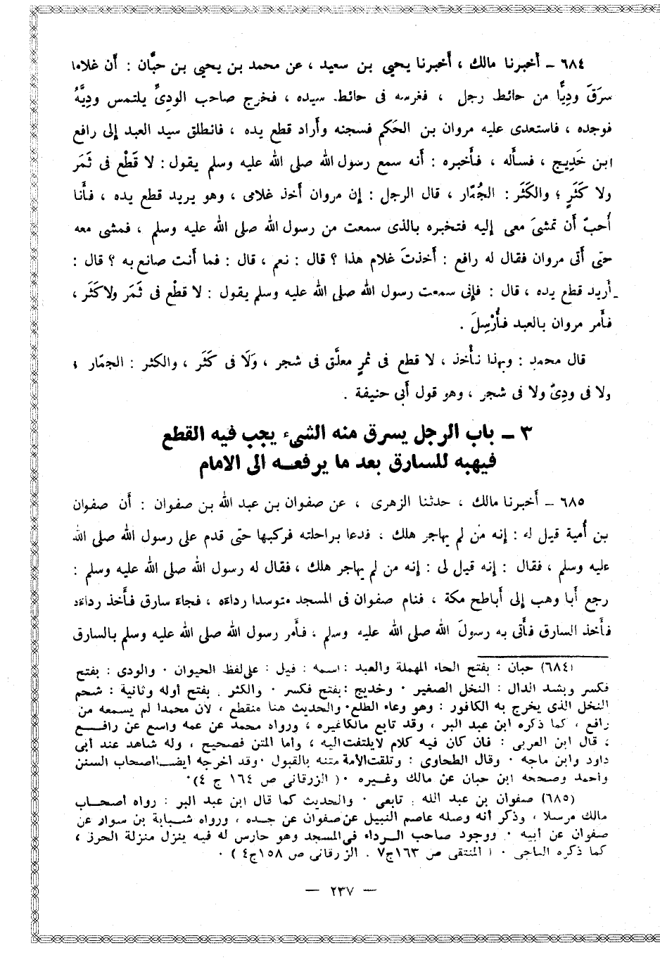 ٦٨٤ - أَخْبَرَنَا مَالِكٌ، أَخْبَرَنَا يَحْيَى بْنُ سَعِيدٍ، عَنْ مُحَمَّدِ بْنِ يَحْيَى بْنِ حِبَّانَ، أَنَّ غُلامًا سَرَقَ وَدِيًّا مِنْ حَائِطِ رَجُلٍ، فَغَرَسَهُ فِي حَائِطِ سَيِّدِهِ، فَخَرَجَ صَاحِبُ الْوَدِيِّ يَلْتَمِسُ وَدِيَّهُ، فَوَجَدَهُ فَاسْتَعْدَى عَلَيْهِ مَرْوَانُ بْنُ الْحَكَمِ، فَسَجَنَهُ وَأَرَادَ قَطْعَ يَدِهِ، فَانْطَلَقَ سَيِّدُ الْعَبْدِ إِلَى رَافِعِ بْنِ خَدِيجٍ، فَسَأَلَهُ، فَأَخْبَرَهُ أَنَّهُ سَمِعَ رَسُولَ اللَّهِ صَلَّى اللَّهُ عَلَيْهِ وَسَلَّمَ، يَقُولُ: «لا قَطْعَ فِي ثَمَرٍ وَلا كَثْرٍ» .